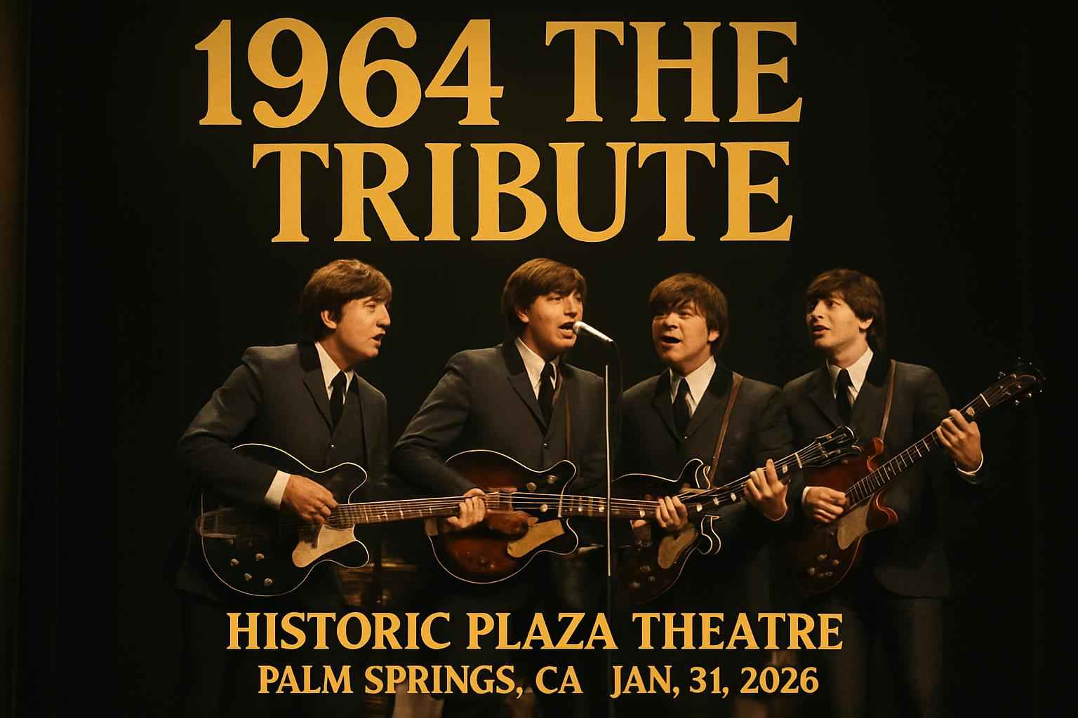 1964 The Tribute recreates the excitement of a live Beatles performance using period instruments vintage costumes and spot-on vocals. The Historic Plaza Theatre in Palm Springs provides an intimate setting known for its rich acoustics and historic charm. Doors open at 0630 PM and the show begins promptly at 0730 PM. Choose your preferred seats and experience a night of nostalgia and world-class musicianship.