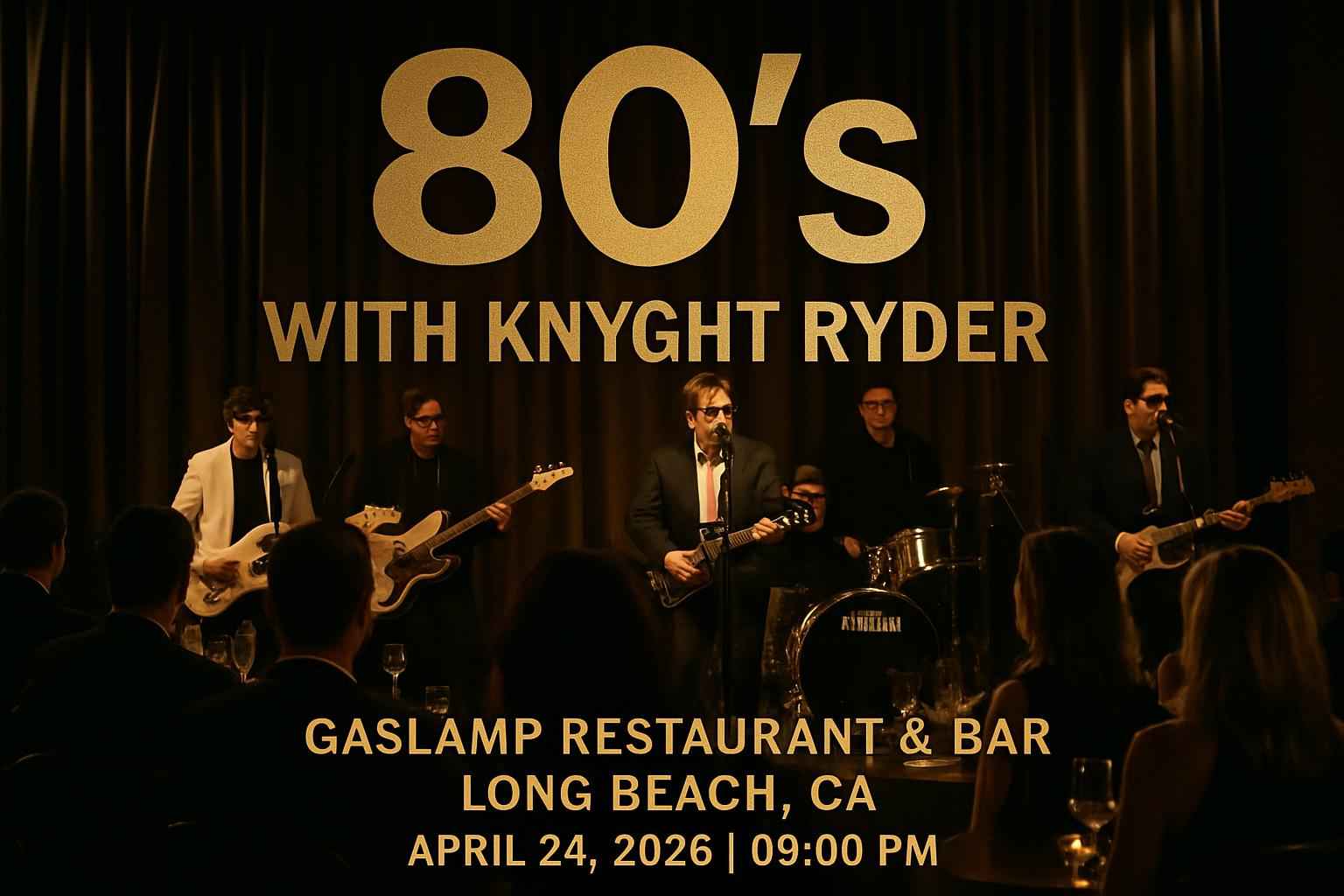 Knyght Ryder brings the best of 80s music to Gaslamp Restaurant and Bar in Long Beach on April 24 2026. Doors open at 8 PM and the show starts at 9 PM. The venue offers spacious seating savory food and signature cocktails. Located minutes from downtown Long Beach Gaslamp Restaurant and Bar is a top destination for live music and nightlife events. Arrive early for happy hour specials and a prime spot near the stage.