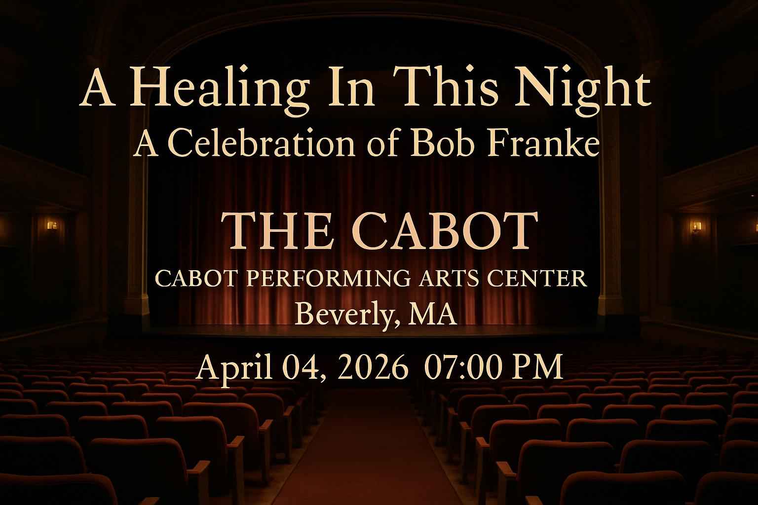 Experience the magic of A Healing In This Night A Celebration of Bob Franke at The Cabot Performing Arts Center in Beverly MA on April 4 2026 at 7 PM. Join music lovers from across Massachusetts for a night dedicated to the legendary Bob Franke with live performances and heartfelt tributes. Secure your tickets with exclusive RSVP Event Agency promo codes for unbeatable savings at checkout.