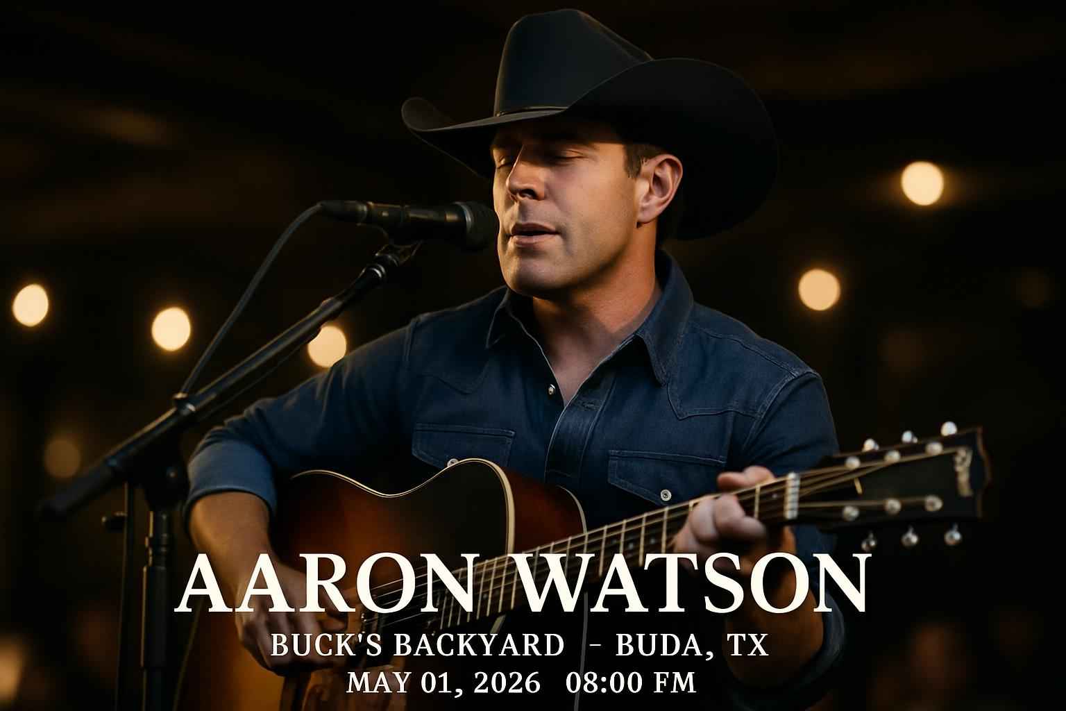 Aaron Watson performs live at Buck’s Backyard in Buda TX on May 01 2026. Doors open at 6:00 PM. This concert features chart-topping hits and fan favorites in a family-friendly outdoor setting. Buck’s Backyard offers easy parking and food trucks on-site for concertgoers. Enjoy a night of country music and support local Texas artists with your friends and family.