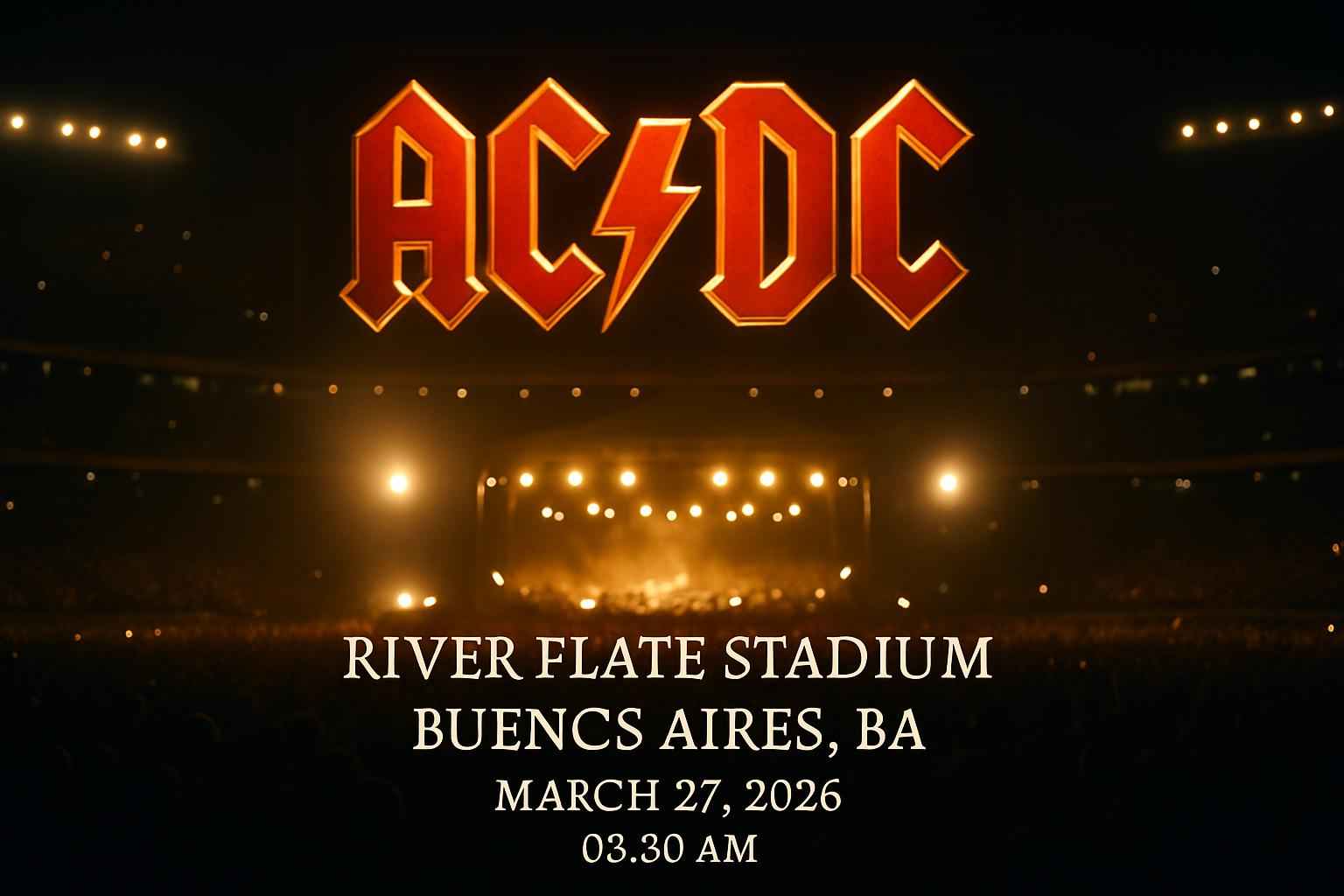 The AC-DC concert at River Plate Stadium Buenos Aires BA is set for March 27 2026 at 0330 AM This massive stadium event brings legendary rock performances and state-of-the-art production to fans from around Argentina and beyond Secure tickets early with exclusive coupon codes for AC-DC River Plate Stadium and enjoy special discounts only available through RSVP Event Agency