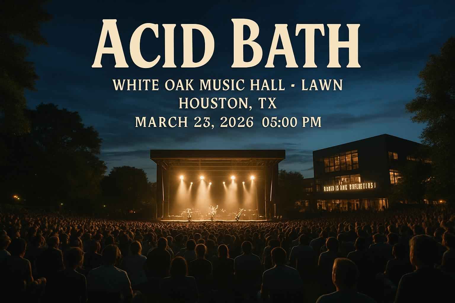 Experience Acid Bath live at White Oak Music Hall – Lawn in Houston TX on March 28 2026 at 5 PM. This highly anticipated concert draws music fans from across Houston and surrounding areas looking for an unforgettable outdoor show. As a trusted source for Acid Bath coupon codes RSVP Event Agency delivers exclusive savings and local event info to help you secure the best ticket prices for an epic night of rock.