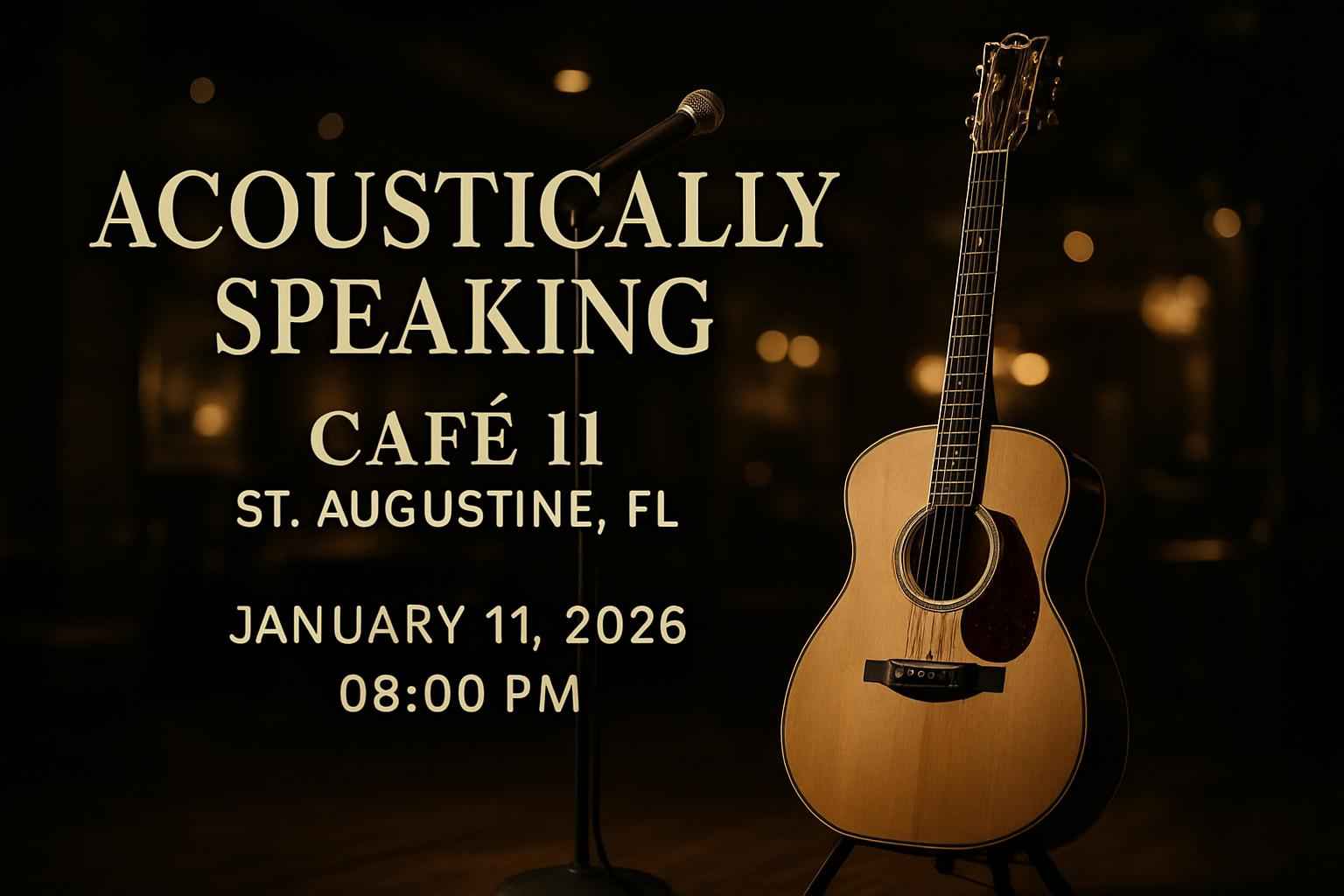 Acoustically Speaking takes place on January 11 2026 at 8:00 PM at Cafe 11 in St. Augustine FL.
