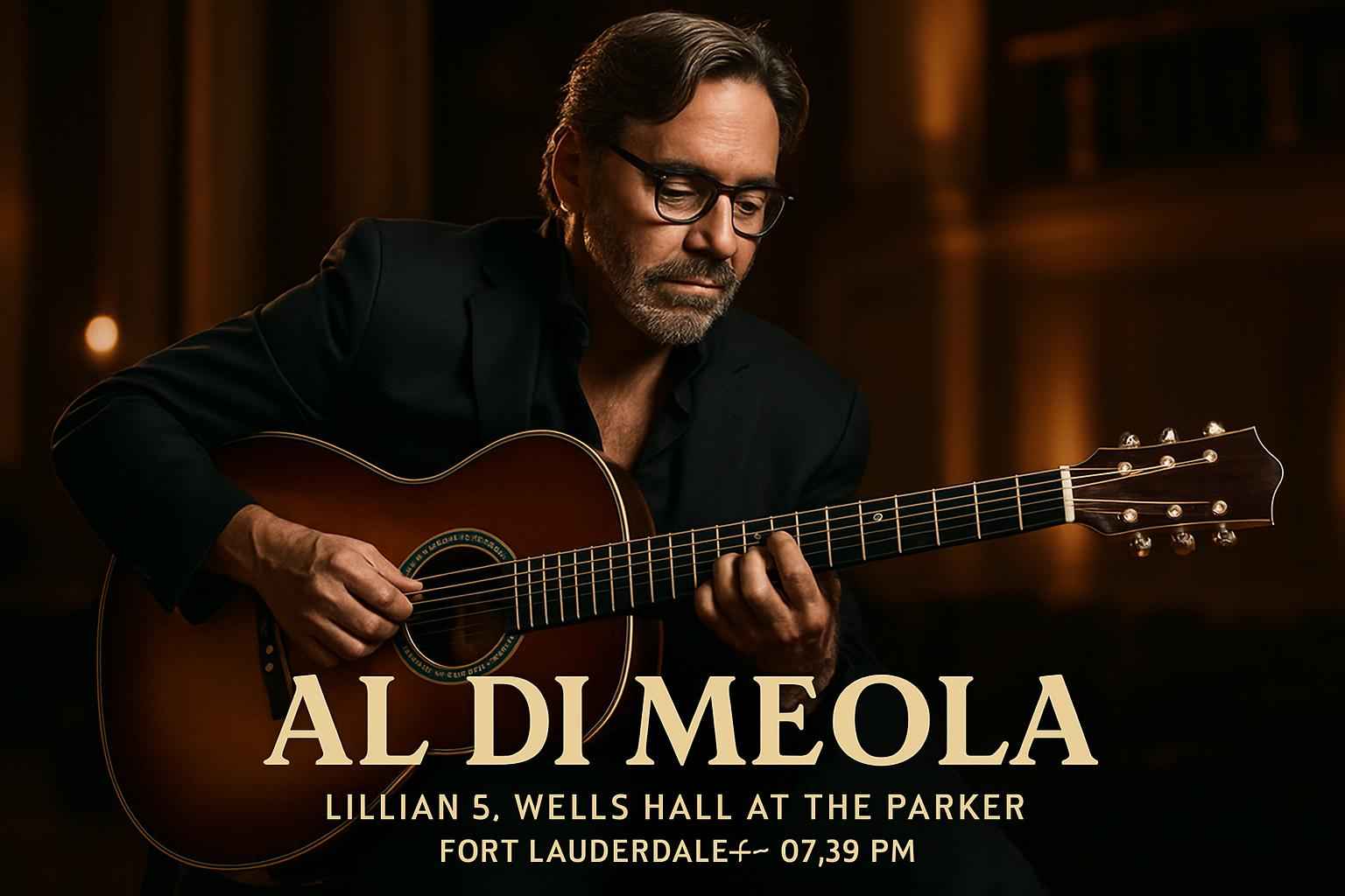 Experience jazz guitar legend Al Di Meola live at Lillian S Wells Hall, The Parker, Fort Lauderdale on January 15, 2026, 7:30 PM. Secure exclusive discount codes and lowest ticket prices via RSVP Event Agency. Enjoy premium seating, excellent acoustics, convenient parking, and verified promo codes for savings on this must-see jazz fusion concert.