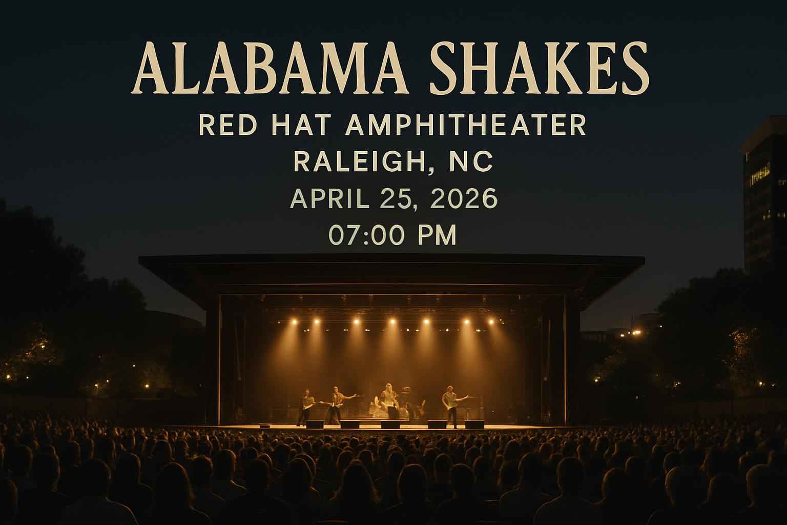 The Alabama Shakes concert at Red Hat Amphitheater Raleigh NC is scheduled for April 25 2026 at 700 PM.