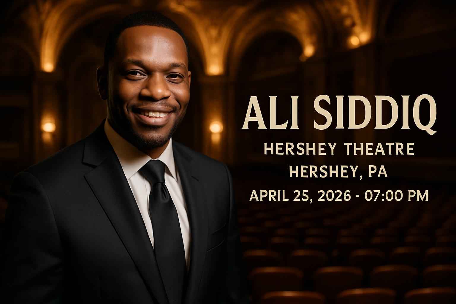 Ali Siddiq takes the stage at 7 PM on April 25 2026. Arrive early for parking and best seating options at Hershey Theatre in Hershey PA.
