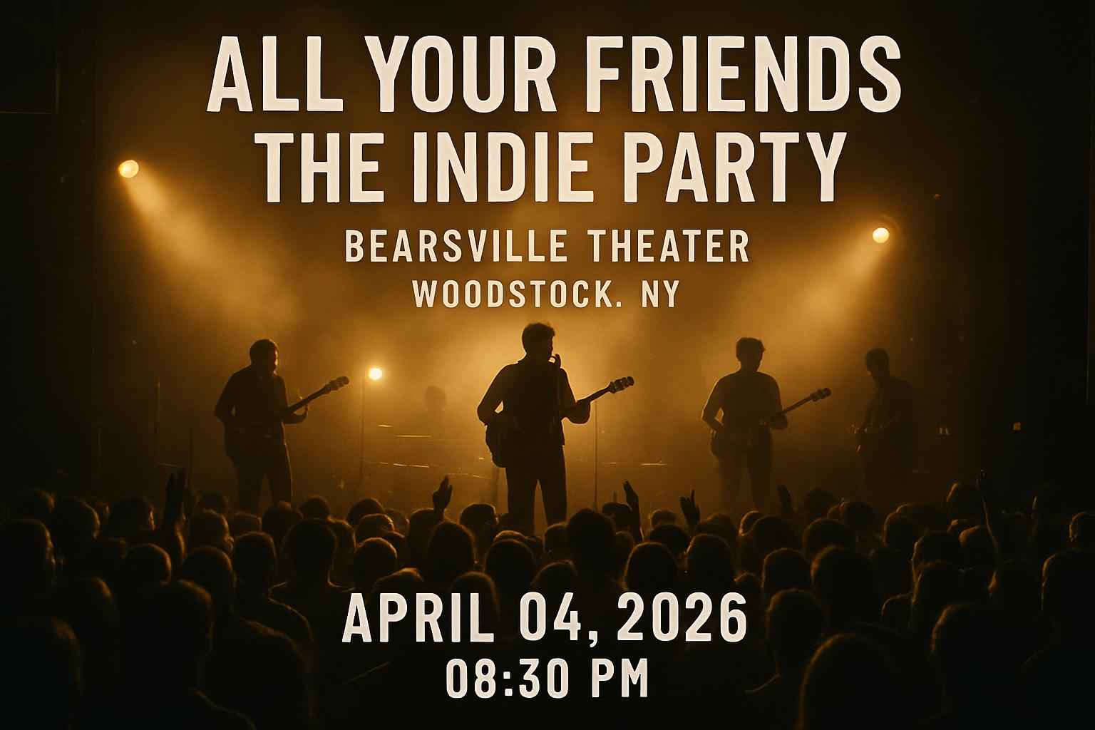 All Your Friends The Indie Party features a curated playlist of indie favorites and live sets at Bearsville Theater Experience high-energy dancing a unique crowd and local music vibes This Woodstock NY party draws indie fans from across the region for an unforgettable night Take advantage of RSVP Event Agency ticket discounts and join the best indie event of the year