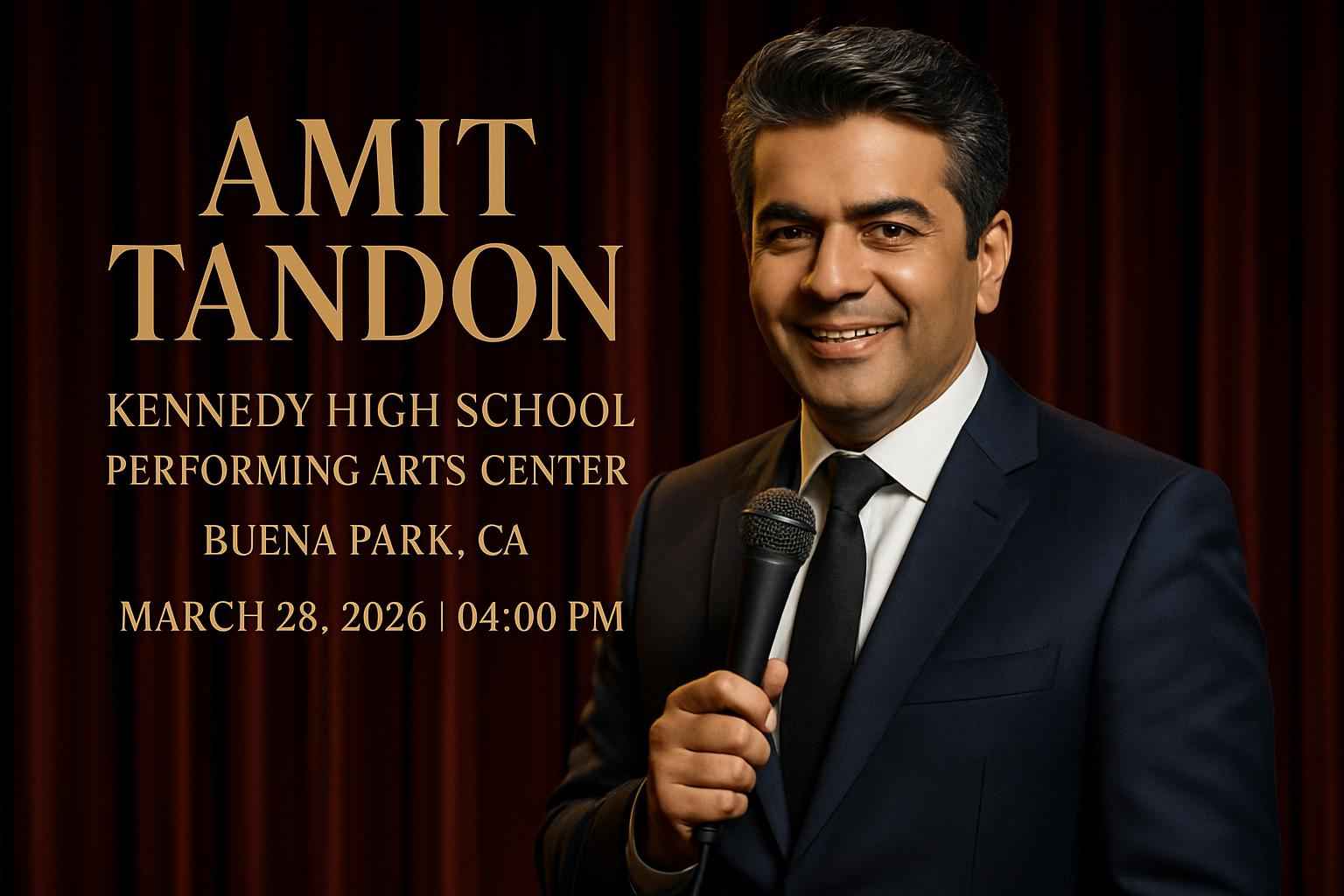 Experience the best of live stand-up with Amit Tandon at Kennedy High School Performing Arts Center in Buena Park CA on March 28 2026 at 4:00 PM. Secure your spot for an evening of comedy from one of Indias leading stand-up comedians. RSVP Event Agency delivers the lowest ticket prices and exclusive promo codes for Amit Tandon Kennedy High School Buena Park. Get up-to-date info on event details parking deals and seat availability today.