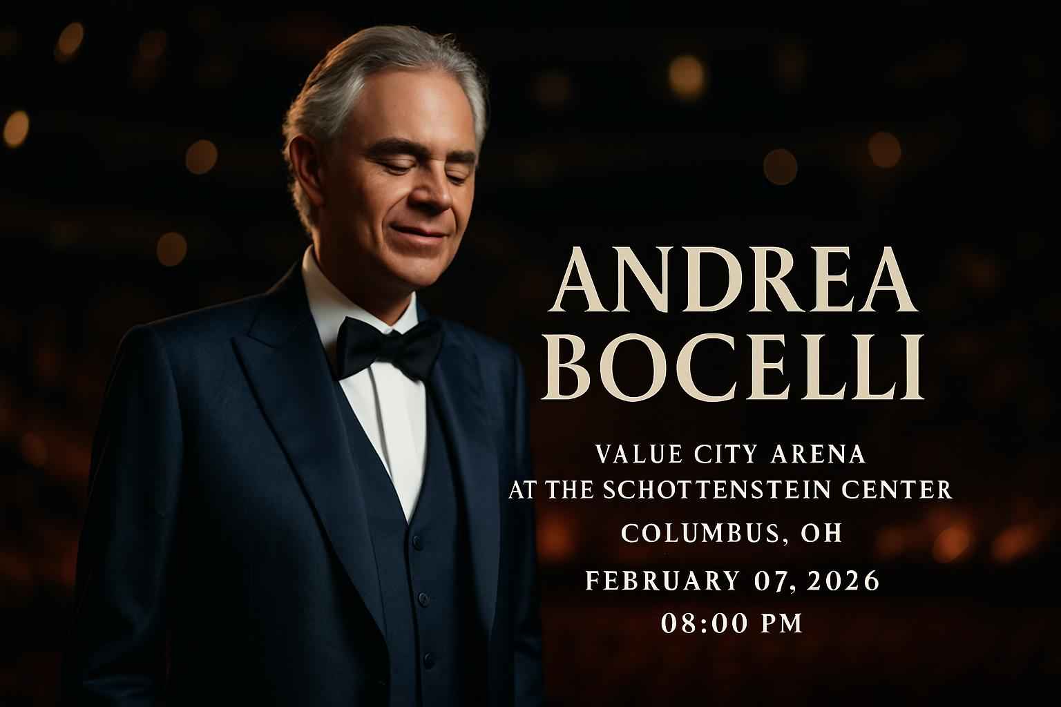 Andrea Bocelli will perform live at Value City Arena at The Schottenstein Center on February 07 2026 starting at 800 PM. This celebrated artist brings his renowned tenor voice to Columbus for a night of classical and contemporary music. Value City Arena offers excellent seating and acoustics making it the top destination for live concerts in Central Ohio. Parking is available onsite with easy access from major highways.