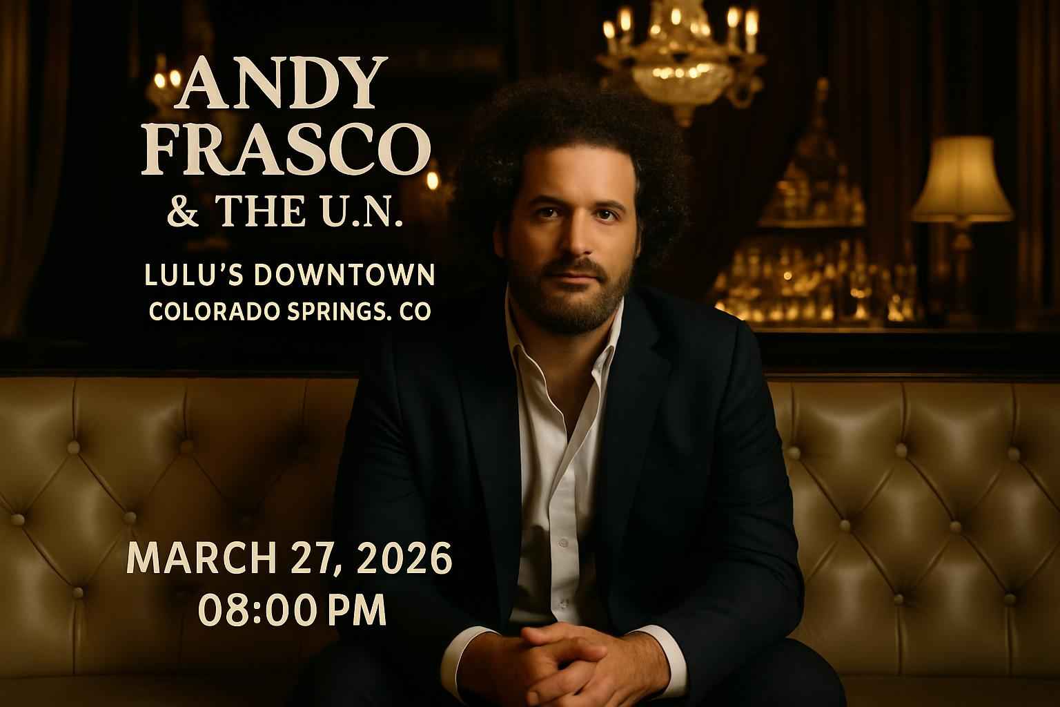 Andy Frasco & The U.N. bring their legendary energy to Lulu’s Downtown Colorado Springs for one night only on March 27 2026. The venue is located in downtown Colorado Springs close to local dining and nightlife. Doors open at 7:00 PM and the show begins at 8:00 PM. Expect a dynamic blend of rock soul and blues with an interactive crowd experience. Ticket availability is limited so secure your seat early for this unforgettable evening.