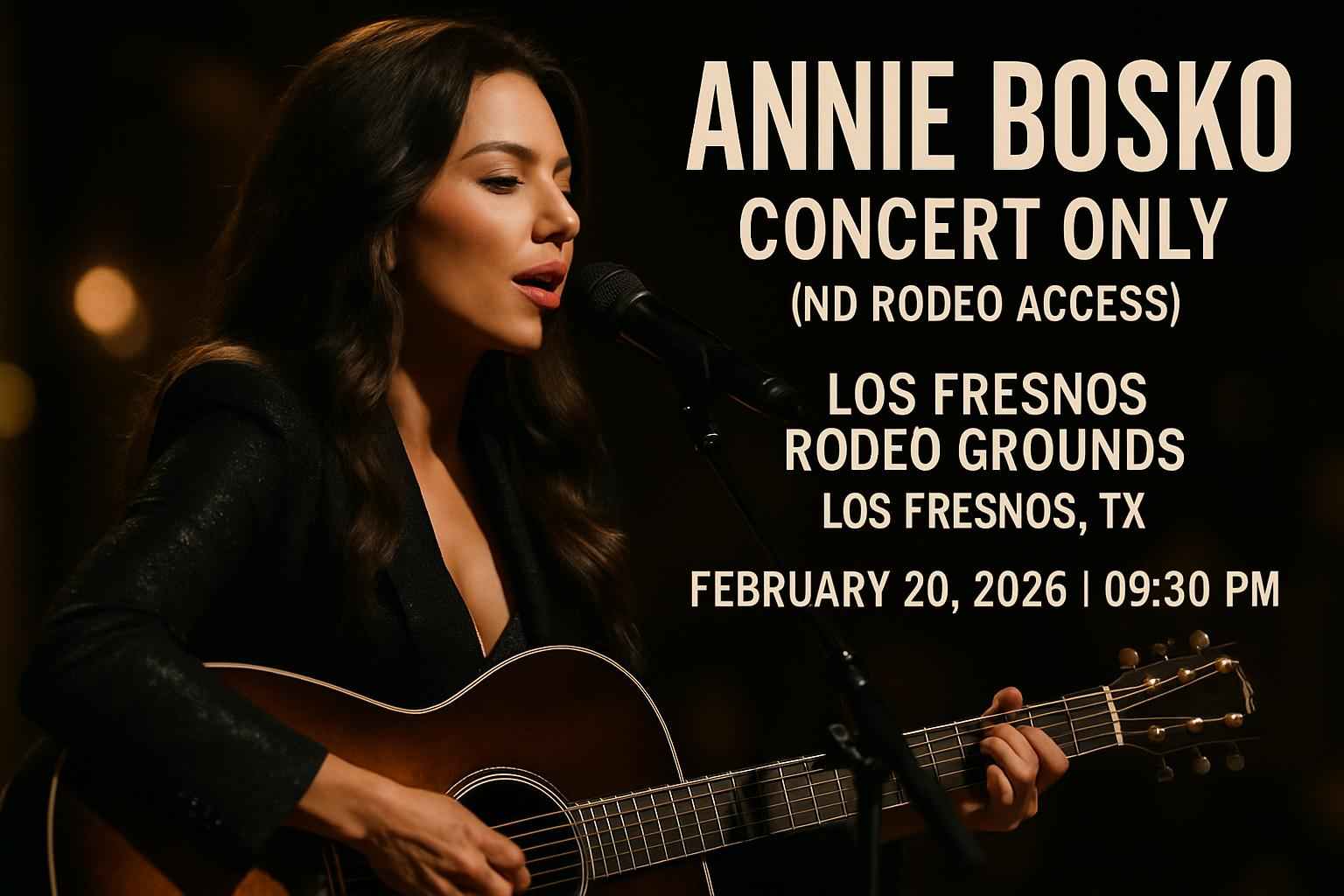 Annie Bosko takes the Los Fresnos Rodeo Grounds stage on February 20 2026 at 9:30 PM for a special concert-only performance with no rodeo access included. Fans searching for Annie Bosko Los Fresnos concert information find up-to-date event times venue address ticket policies and entry details here. Join music lovers from Brownsville, Harlingen, and across Cameron County for this local music showcase.