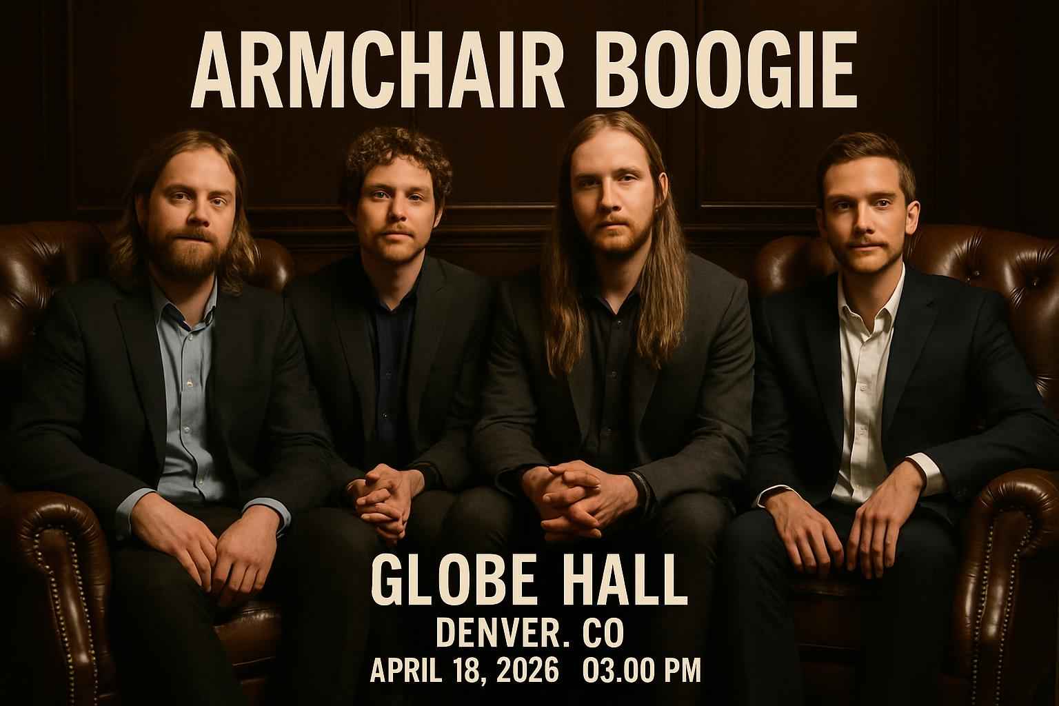 The Armchair Boogie concert begins at 8:00 PM on April 16 2026 at Globe Hall in Denver CO.