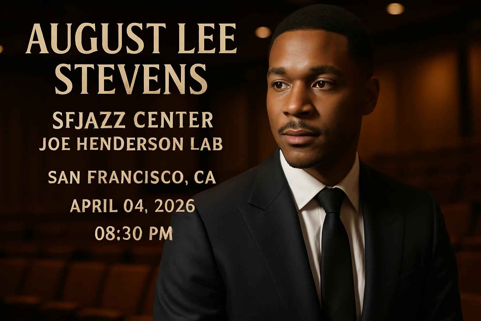Experience the acclaimed artistry of August Lee Stevens live at SFJazz Center – Joe Henderson Lab in San Francisco CA on April 04 2026 at 0830 PM. Secure your spot at this highly anticipated jazz performance in the heart of San Francisco and take advantage of exclusive promo codes from RSVP Event Agency for unmatched savings on tickets. Unlock premium ticket discounts and enjoy an unforgettable night of jazz in one of the citys top live music venues.