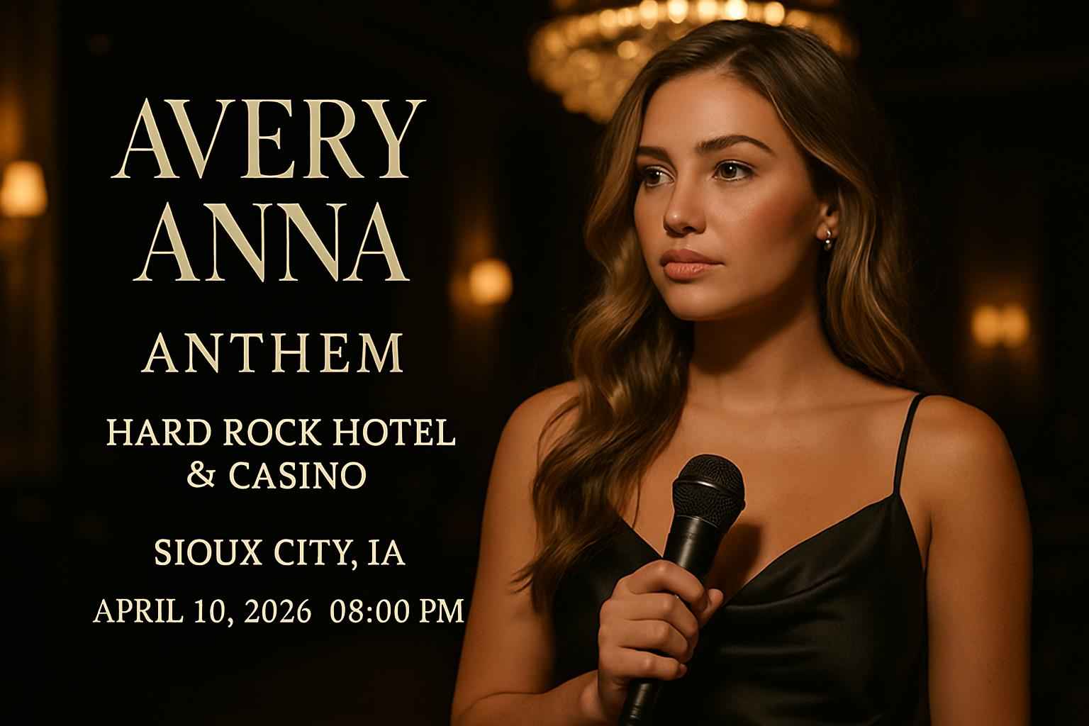 Avery Anna will perform live at Anthem located at Hard Rock Hotel & Casino Sioux City. The concert begins at 8 PM on Thursday April 10 2026. Venue address is 111 3rd St Sioux City IA 51101. This event attracts country music fans searching for authentic live music and top-tier sound in a legendary Iowa setting. Secure your Avery Anna tickets at exclusive prices using RSVP Event Agency promo codes now.