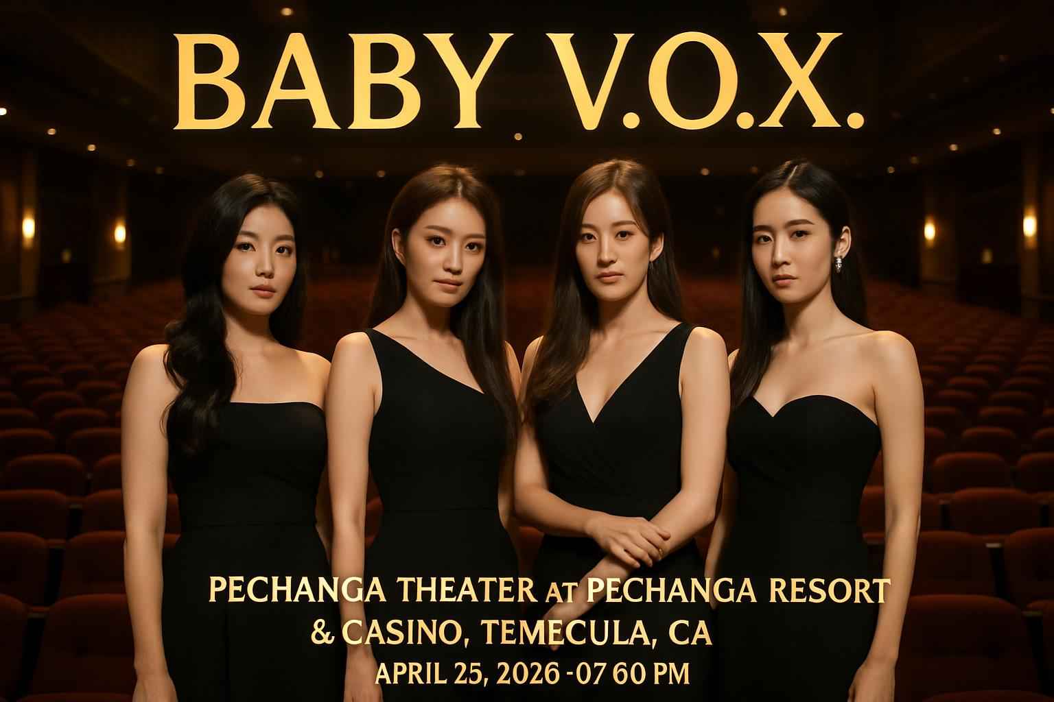 Baby V O X returns to the stage in Temecula for a powerful live performance at Pechanga Theater. Located inside the Pechanga Resort and Casino this venue offers premier acoustics and convenient parking. Doors open at 6 PM for the 7 PM show. Enjoy easy access to dining and entertainment throughout Pechanga Resort. This concert is perfect for K-pop fans and Temecula locals seeking unforgettable music experiences.