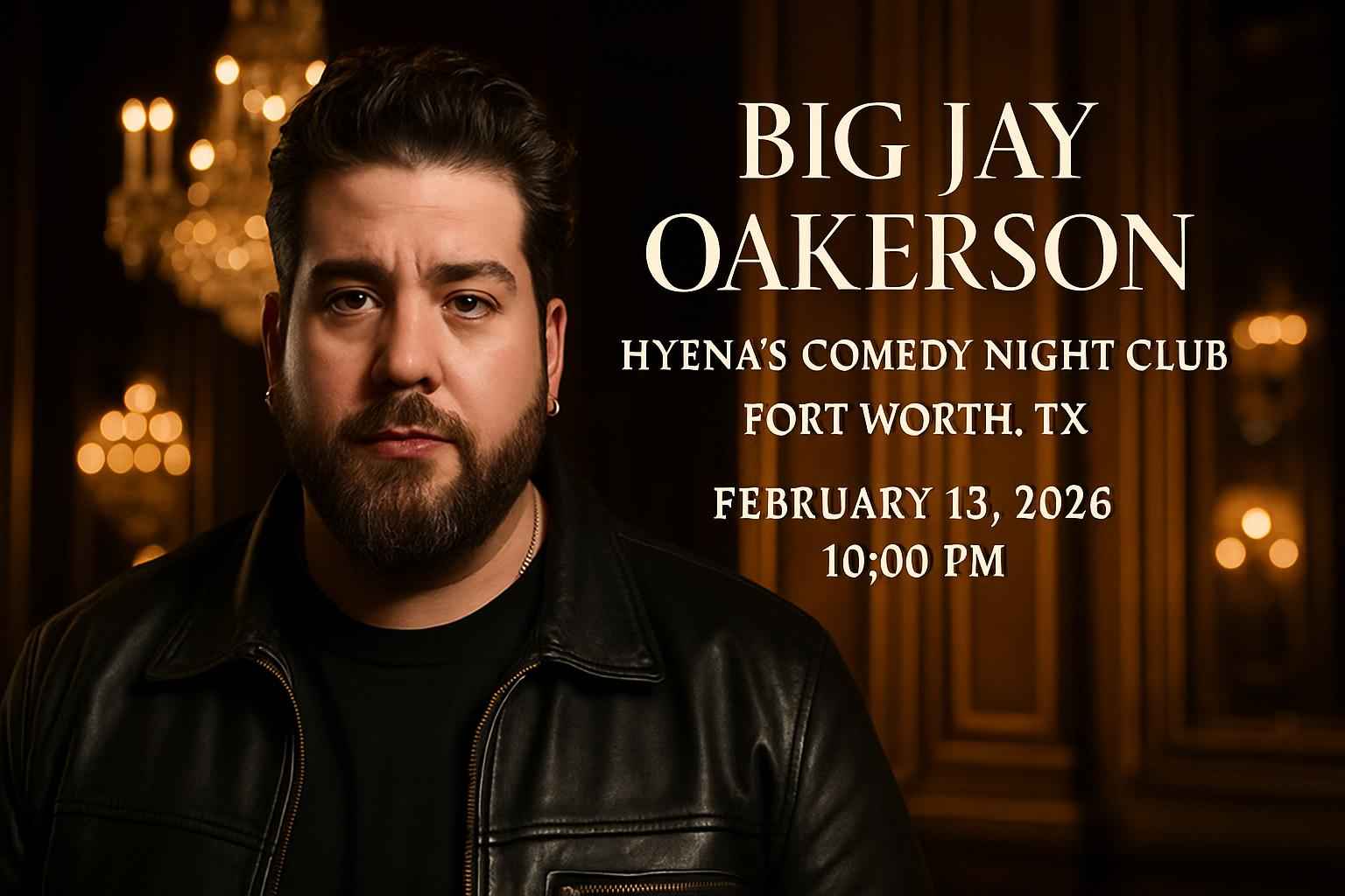 Big Jay Oakerson brings his signature comedic style to Hyenas Comedy Night Club located in the heart of Fort Worth TX. The show starts at 10:00 PM on February 13 2026. This event draws both local fans and out-of-town visitors searching for top comedy shows in DFW. Reserve your seats now for a night of laughter and entertainment at one of Fort Worths best comedy venues.