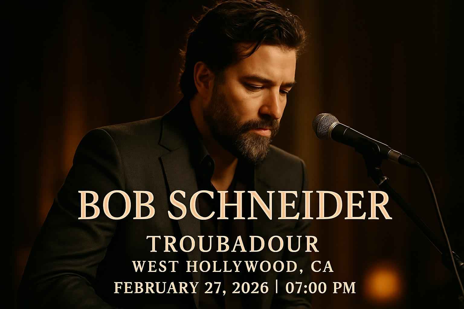Bob Schneider will perform at Troubadour located at 9081 Santa Monica Blvd West Hollywood CA on February 27 2026 starting at 0700 PM. The venue is renowned for its intimate setting and top-tier acoustics making it a favorite among music fans in West Hollywood and the greater Los Angeles area. Arrive early for best parking and nearby dining options before the show.