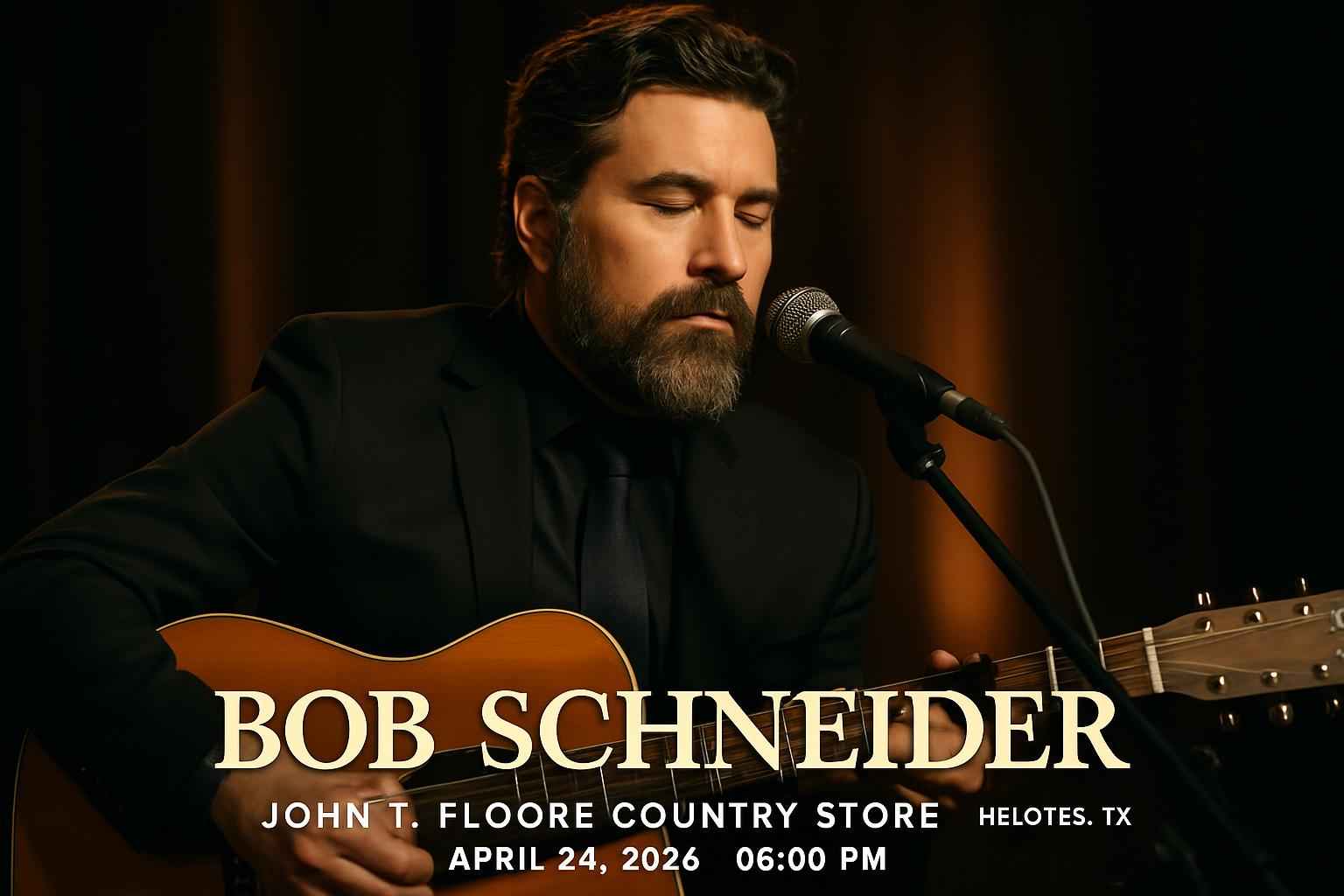 Bob Schneider performs at 8 PM on April 24 2026. Doors open at 7 PM at John T. Floore Country Store in Helotes TX.