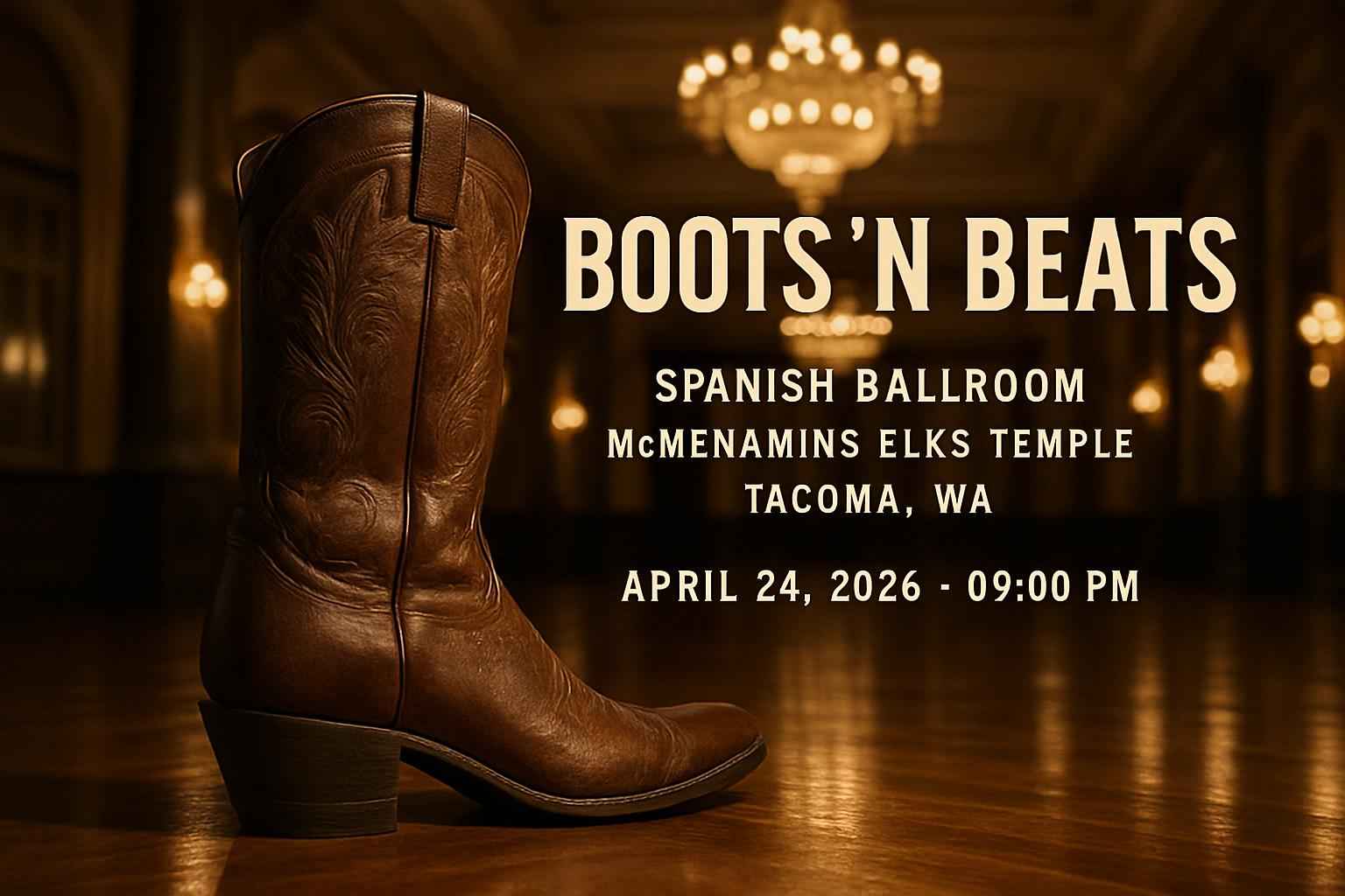 Boots N Beats takes place at the historic Spanish Ballroom in McMenamins Elks Temple located in downtown Tacoma WA. The event starts at 9 PM on April 24 2026. Expect a lively crowd live DJs and a spacious dance floor perfect for line dancing and two-stepping. Doors open early for ticket holders so arrive in advance for easy entry and pre-show activities.