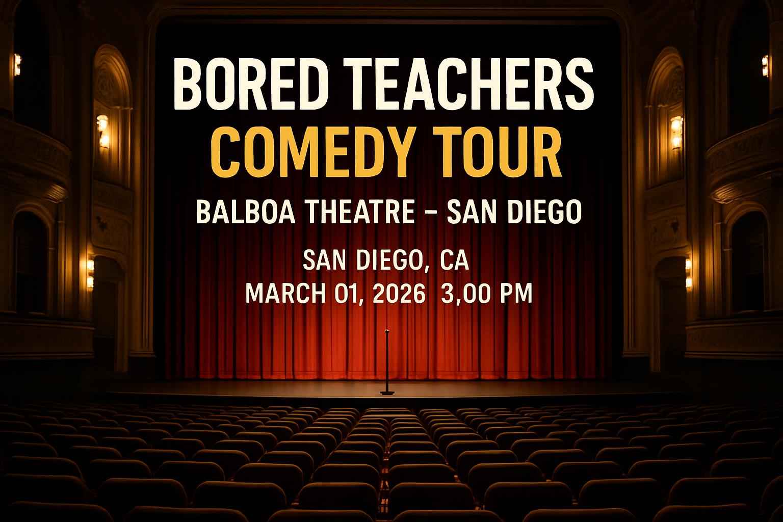 The Bored Teachers Comedy Tour delivers a fresh comedy experience for educators and families. The event takes place at Balboa Theatre 868 Fourth Avenue San Diego CA 92101 on Sunday March 1 2026 at 3 PM. Enjoy an afternoon filled with top comedy acts highlighting the fun side of teaching and classroom life. Early ticket buyers receive access to RSVPs exclusive discount codes and premium seating options.