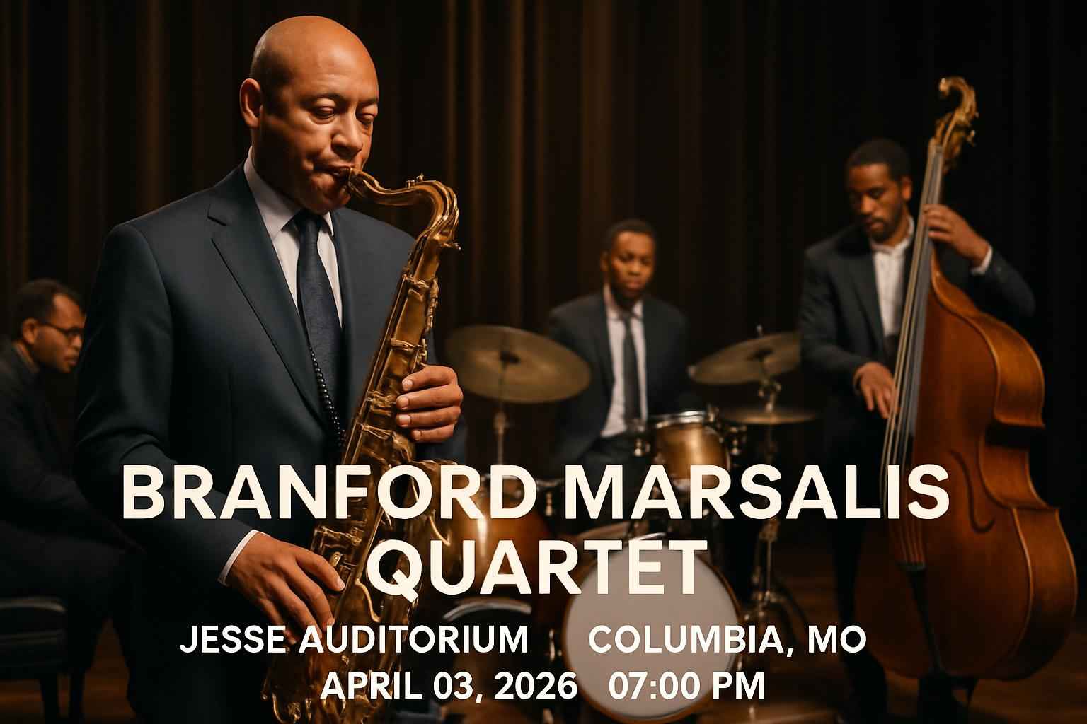 Experience the electrifying Branford Marsalis Quartet live at Jesse Auditorium in Columbia MO on April 03 2026 at 7 PM. This world-class jazz event brings the legendary Grammy-winning saxophonist and his renowned ensemble to the heart of Missouri for one unforgettable night. Secure the best Branford Marsalis Quartet tickets at discounted prices using exclusive RSVP Event Agency promo codes designed for local fans and music lovers seeking top savings.