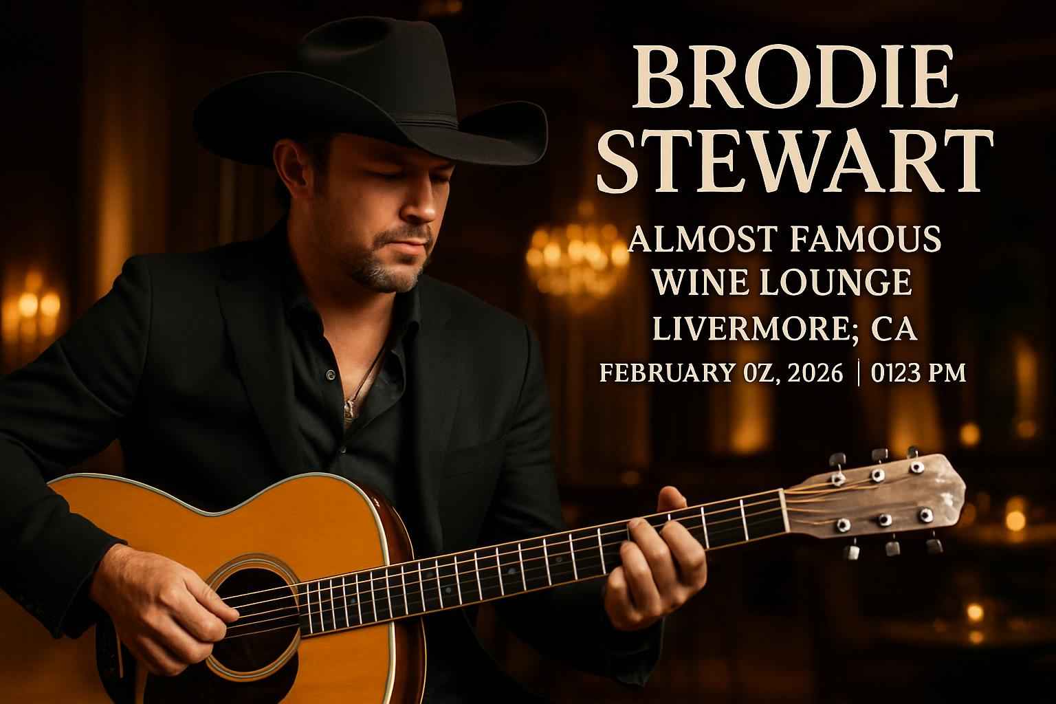 Brodie Stewart brings an electrifying performance to Almost Famous Wine Lounge in Livermore CA. The event takes place on February 7 2026 at 730 PM. Enjoy live country rock music in a unique venue surrounded by local wineries and vibrant downtown Livermore energy. With high search demand for Brodie Stewart tickets Livermore and Almost Famous Wine Lounge concert info this event promises a standout evening in the Bay Area music scene.