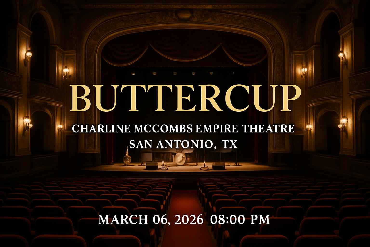 The Buttercup concert begins at 8:00 PM on March 06 2026 at Charline McCombs Empire Theatre in San Antonio TX