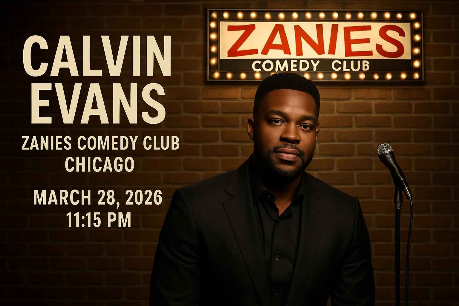Calvin Evans takes the stage at Zanies Comedy Club Chicago on March 28 2026 with a showtime of 1115 PM.