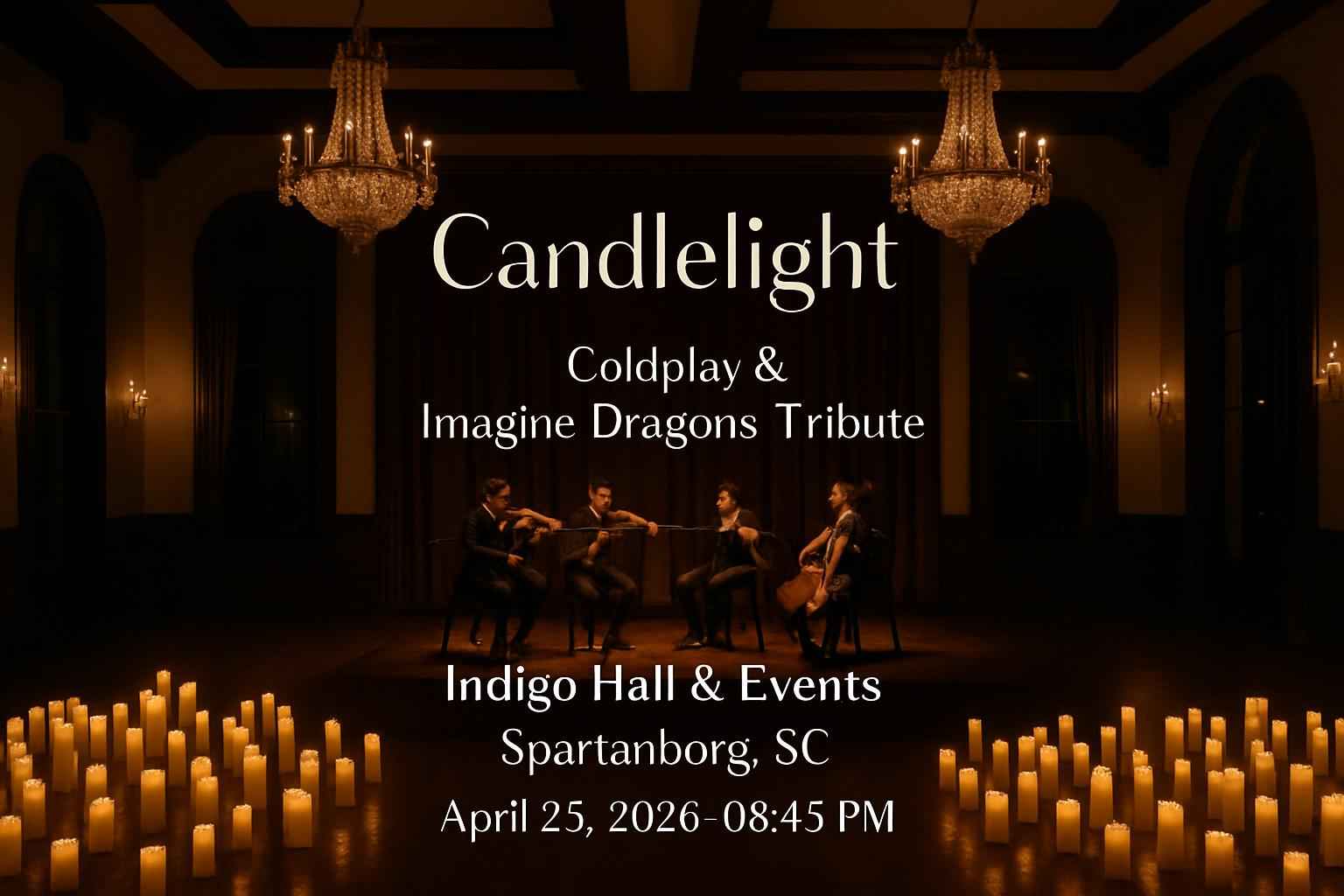 Experience Candlelight Coldplay and Imagine Dragons Tribute at Indigo Hall and Events in Spartanburg SC on April 25 2026 at 0845 PM. Immerse yourself in a live concert illuminated by candlelight featuring the greatest hits of Coldplay and Imagine Dragons performed by top musicians in a unique atmosphere. This exclusive event attracts music fans searching for unforgettable live music experiences in Spartanburg and those looking for promo codes for Candlelight concerts. Secure exclusive RSVP Event Agency coupon codes and enjoy unbeatable savings on your tickets today.