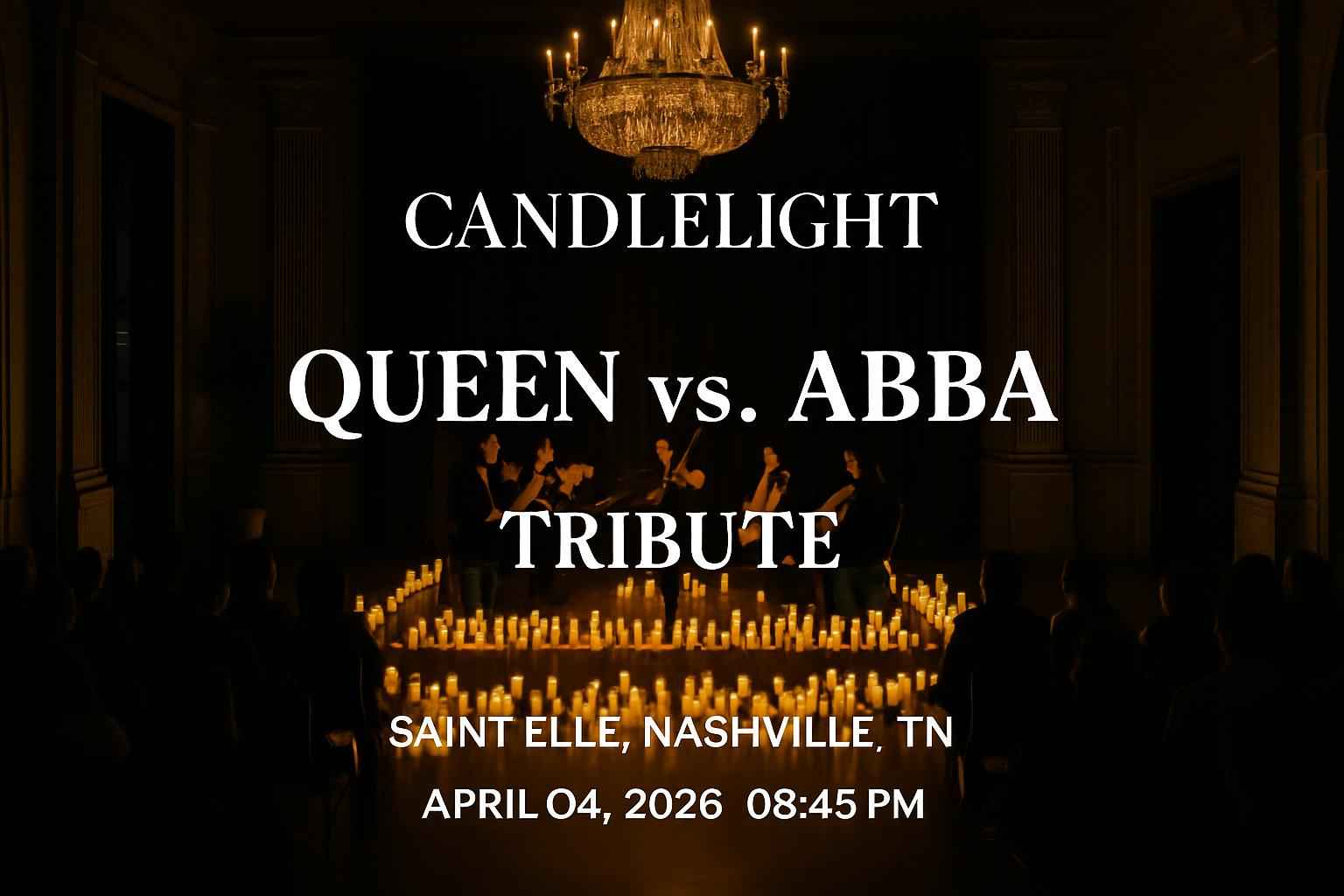 Experience the ultimate music showdown at Candlelight: Queen vs ABBA Tribute at Saint Elle in Nashville TN on April 4 2026 at 0845 PM. This one-night event features talented musicians performing iconic hits from Queen and ABBA in an atmospheric candlelit setting. Secure discount tickets and enjoy exclusive RSVP Event Agency promo codes for unbeatable savings. Join local fans and music lovers for a night of legendary classics and unforgettable ambiance.