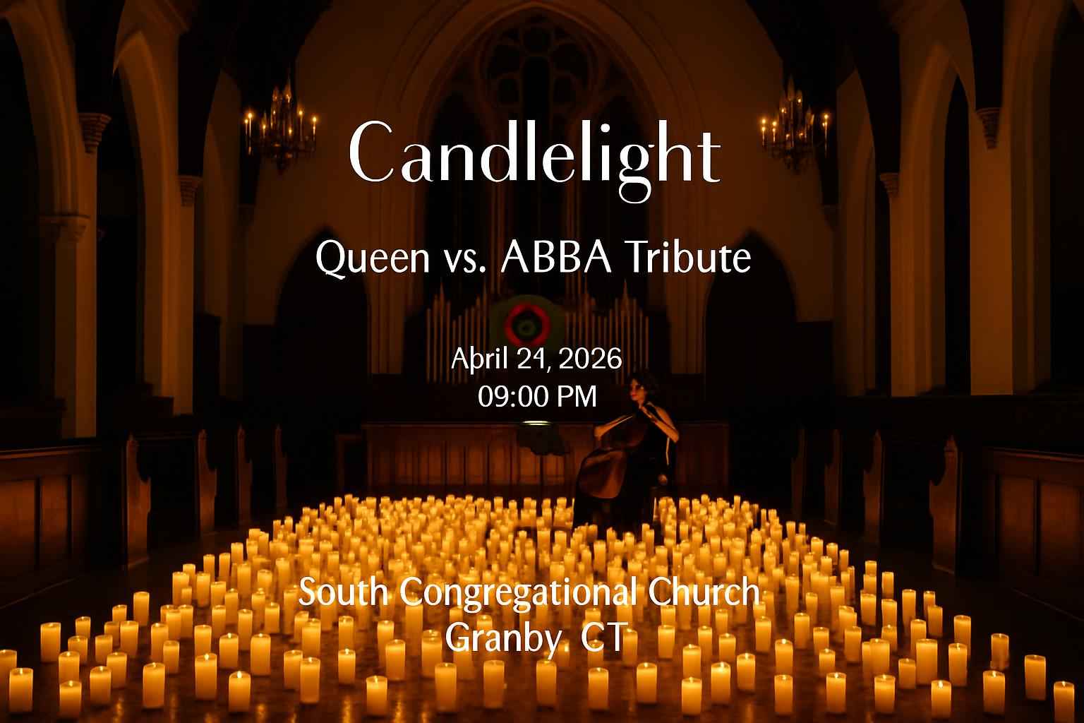 Experience a unique blend of timeless hits at Candlelight: Queen vs. ABBA Tribute, taking place at South Congregational Church in Granby CT on April 24 2026 at 09:00 PM. This exclusive live music event offers a spectacular fusion of Queen and ABBA classics performed under the glow of candlelight for an unforgettable night in Granby. Secure unbeatable value on your tickets with verified promo codes from RSVP Event Agency, the top source for event coupon codes and discounts in Connecticut.
