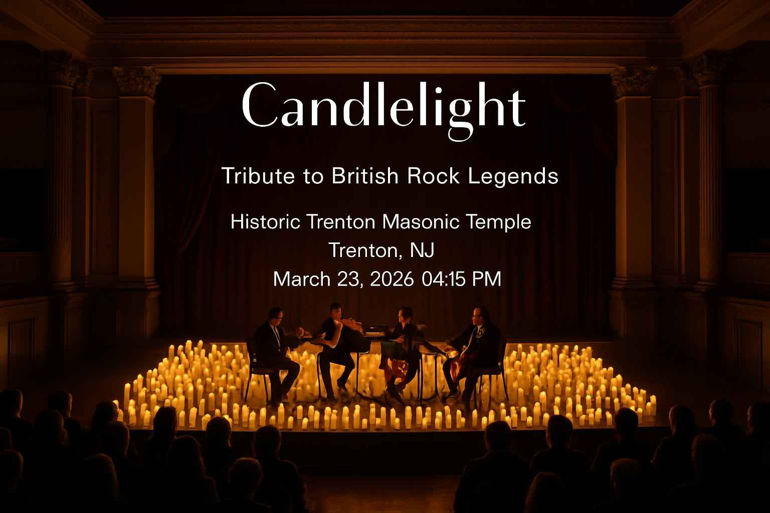 Experience the magic of Candlelight Tribute to British Rock Legends at the Historic Trenton Masonic Temple in Trenton NJ on March 28 2026 at 0415 PM. Find the best Candlelight concert promo codes and exclusive offers from RSVP Event Agency to secure top seats and enjoy authentic British rock performed by talented local musicians. Unlock premium event access for less and enjoy a memorable night in the heart of Trenton surrounded by candlelight and historic architecture.