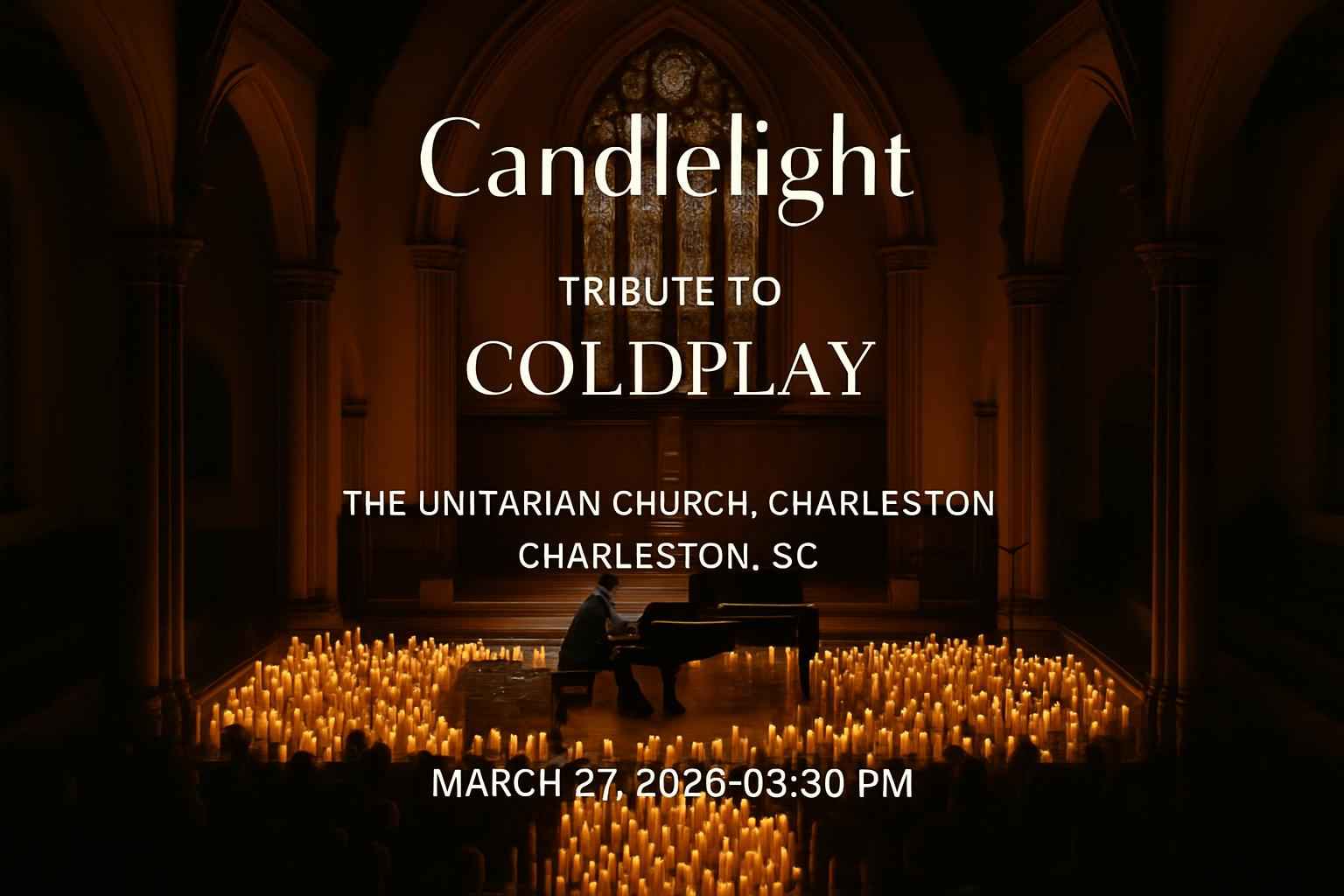 Experience the magic of Candlelight: Tribute to Coldplay at The Unitarian Church in Charleston SC on March 27 2026 at 0830 PM Discover a unique live music event set in one of Charleston’s most stunning historic venues featuring Coldplay’s greatest hits performed by talented local musicians surrounded by hundreds of glowing candles For Charleston music fans and visitors this concert delivers an unforgettable ambiance and a truly immersive show