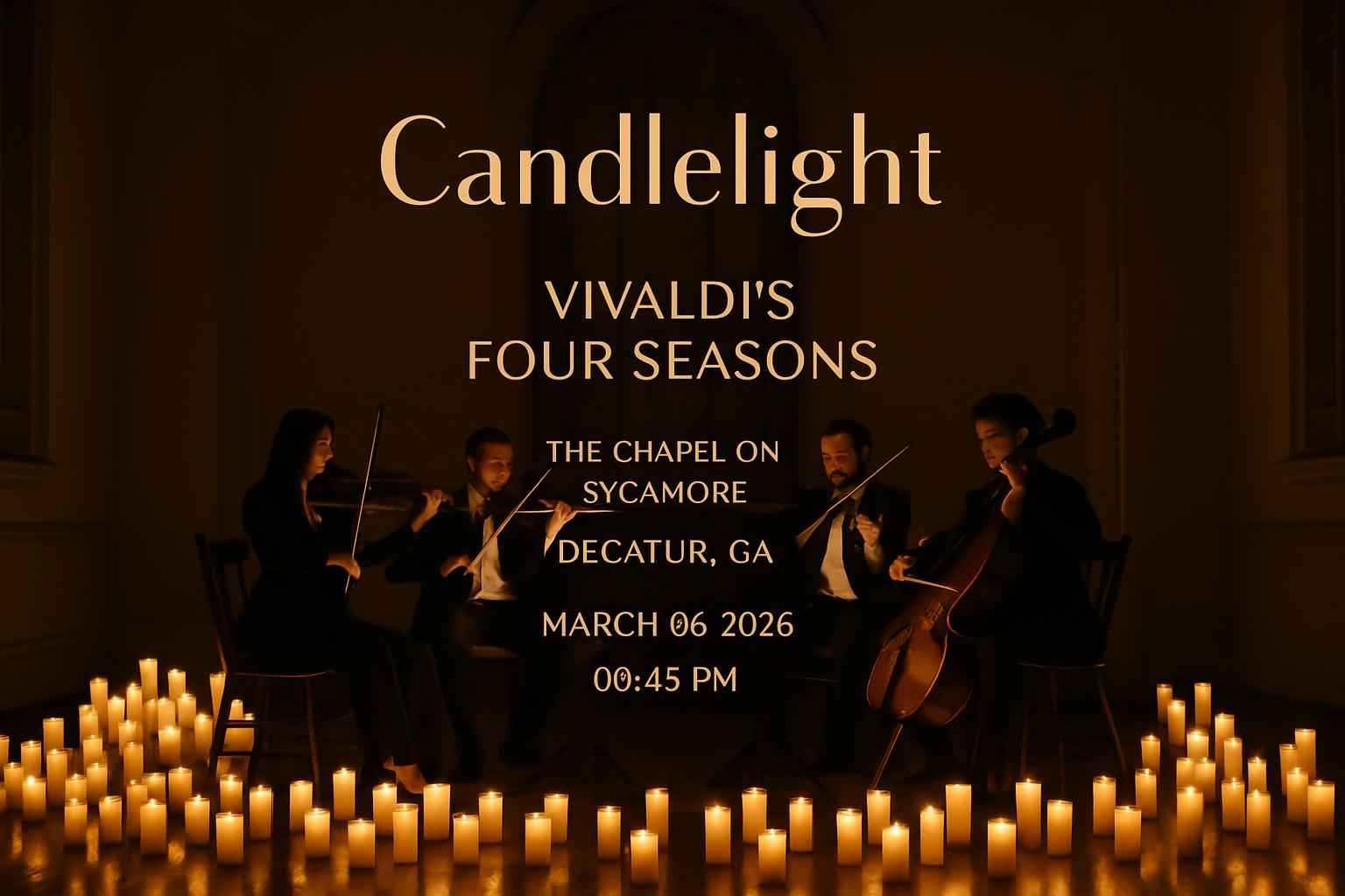 Experience the magic of Candlelight Vivaldis Four Seasons at The Chapel on Sycamore in Decatur GA on March 6 2026 at 8:45 PM. Enjoy an unforgettable concert under the glow of hundreds of candles as world-class musicians bring Vivaldis masterpieces to life. RSVP Event Agency offers exclusive promo codes and discounts for this limited engagement so secure your discounted tickets now to enjoy this immersive classical music event in Decatur.