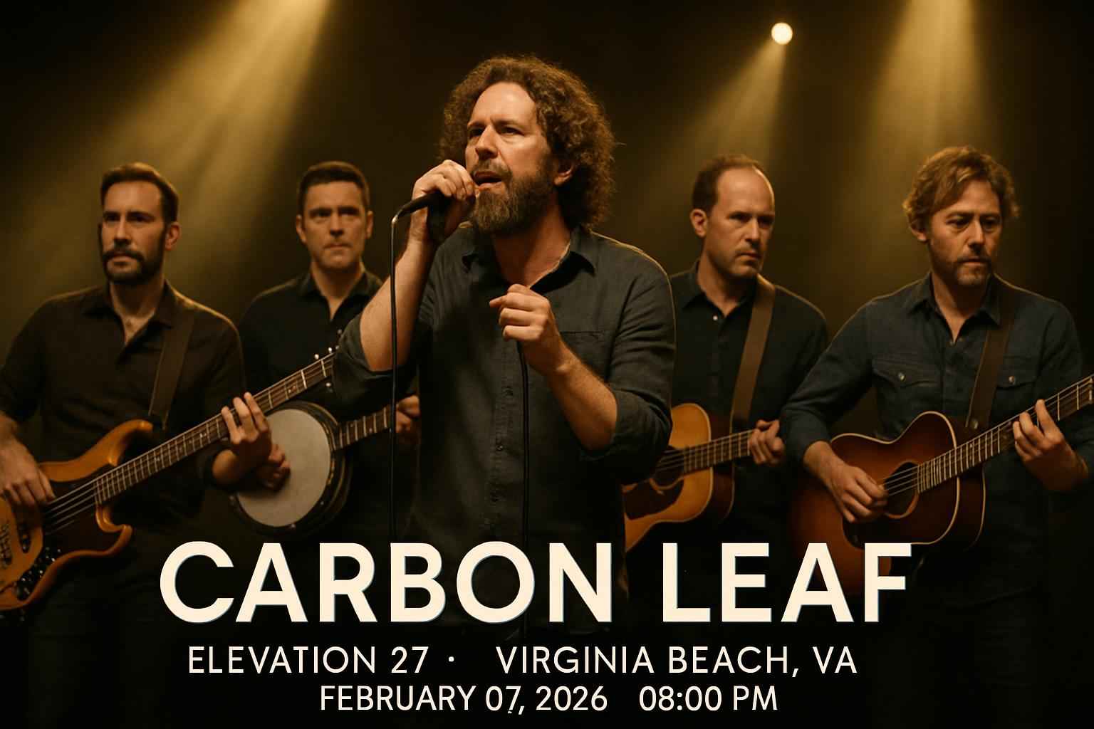 Carbon Leaf brings their signature folk rock sound to Elevation 27 Virginia Beach for one night only. The concert starts at 8 PM on February 07 2026. Elevation 27 is known for an intimate atmosphere premium sound and welcoming staff. The venue address is 600 Nevan Rd Virginia Beach VA 23451. Parking is available on-site and nearby. Arrive early for the best seating options and local dining opportunities around the venue.