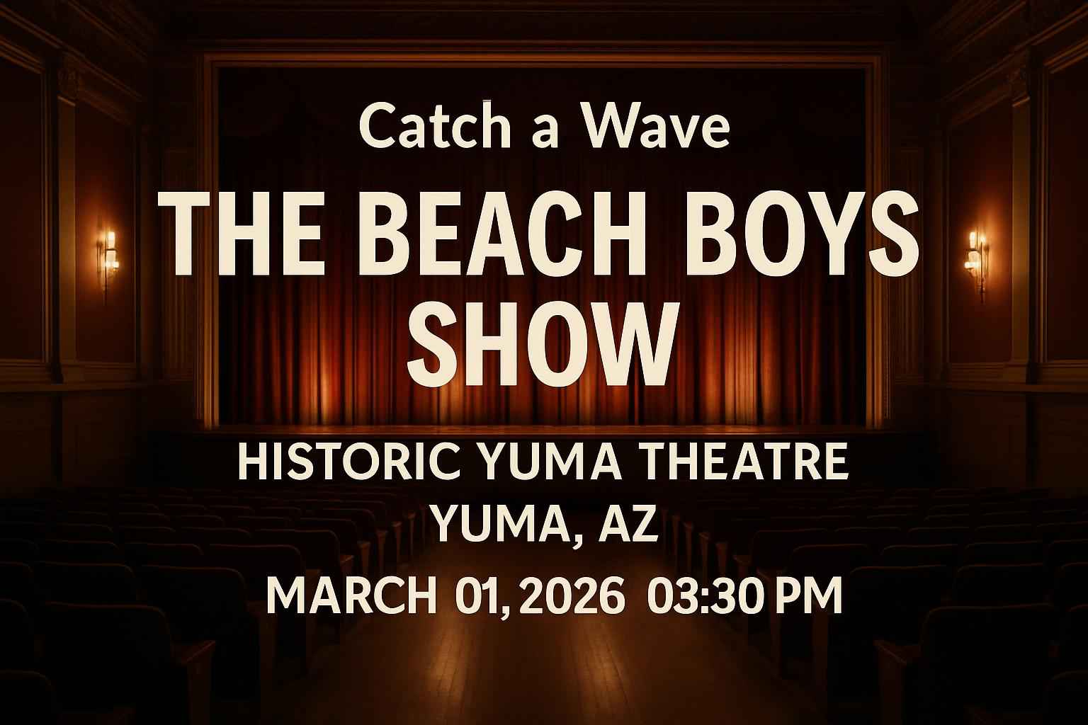 Experience the ultimate tribute to California sound with Catch a Wave – The Beach Boys Show at Historic Yuma Theatre in Yuma AZ on March 01 2026 at 3:30 PM. Secure the best seats and enjoy ticket savings with exclusive RSVP Event Agency promo codes for this highly anticipated concert event. Enjoy timeless hits live on stage and unlock ticket discounts today.