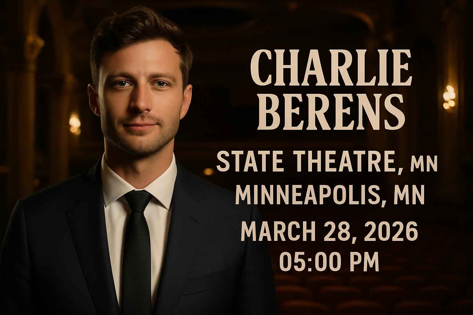 Charlie Berens Minneapolis tour date is March 28 2026 with a 5 PM showtime at State Theatre. This event is part of a national tour known for selling out quickly. Secure your tickets with a valid promo code and enjoy a top-tier comedy experience in Minneapolis.