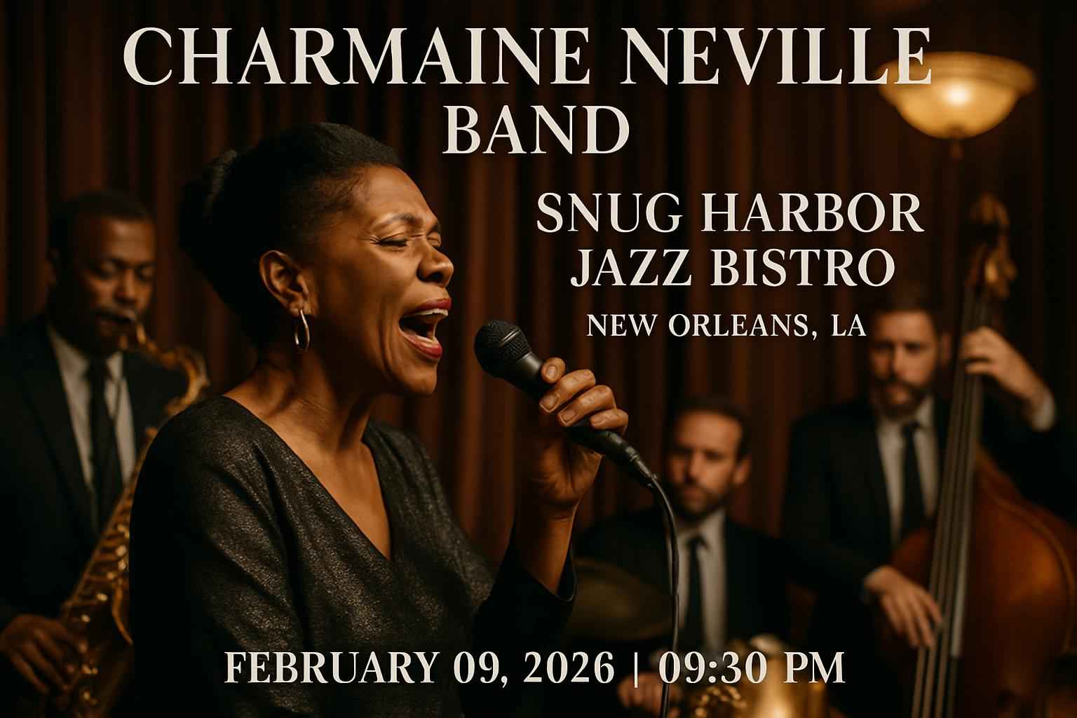 Experience the legendary Charmaine Neville Band at Snug Harbor Jazz Bistro in New Orleans LA on February 09 2026 at 09:30 PM. This unforgettable jazz night in the heart of the Frenchmen Street district features a world-renowned vocalist and her acclaimed ensemble delivering authentic New Orleans jazz in an intimate setting. Secure your seat at one of the citys most celebrated live music events and enjoy premium seating at Snug Harbor Jazz Bistro.