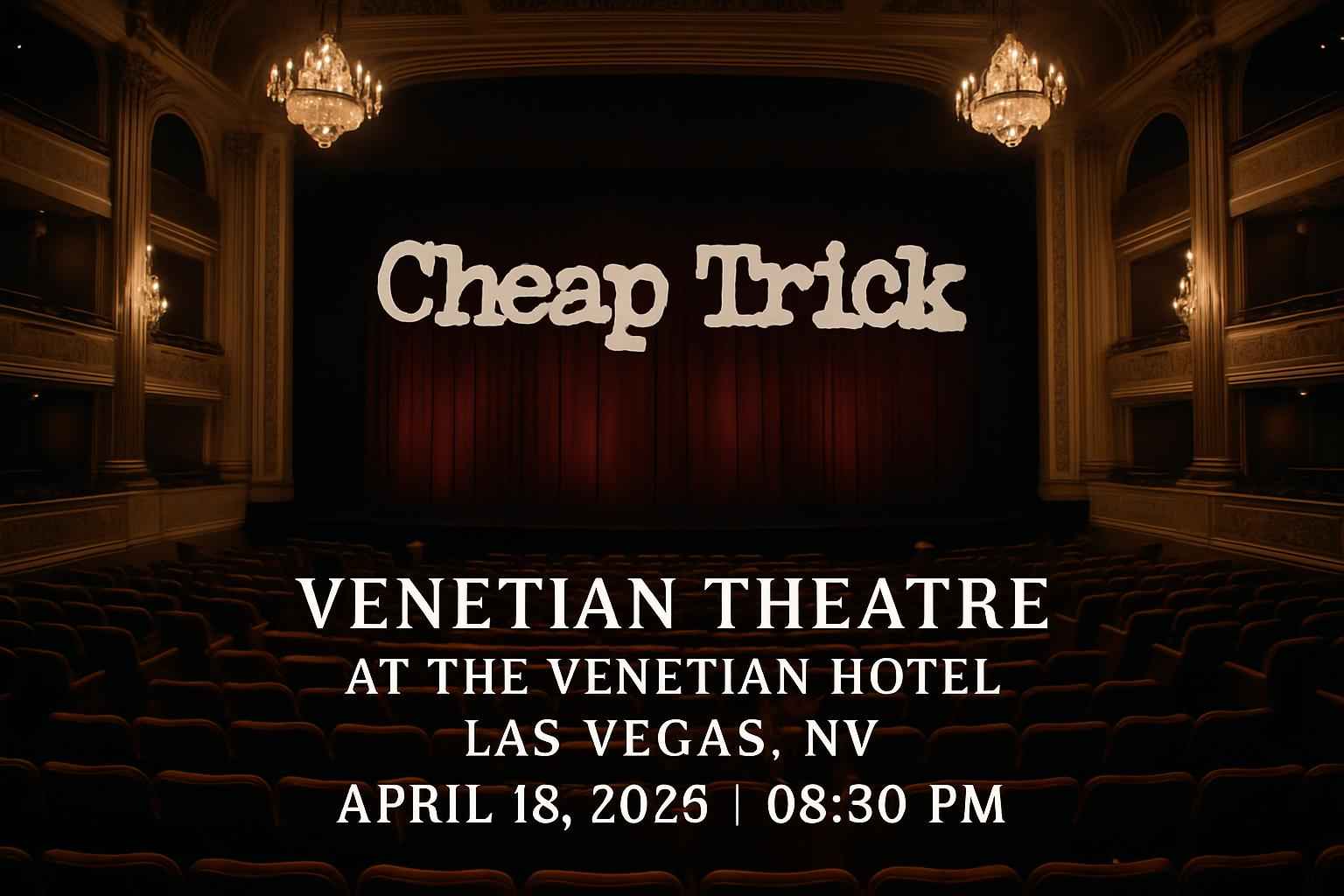Experience Cheap Trick live at the Venetian Theatre At the Venetian Hotel Las Vegas on April 18 2026 at 0830 PM in the heart of Las Vegas NV. This highly anticipated concert brings legendary rock anthems and an electric atmosphere for fans and visitors. Local music lovers and travelers are searching for exclusive Cheap Trick promo codes and event discounts to secure the best seats at unbeatable prices. RSVP Event Agency provides verified coupon codes for Cheap Trick Venetian Theatre Las Vegas so you save big on tickets today.
