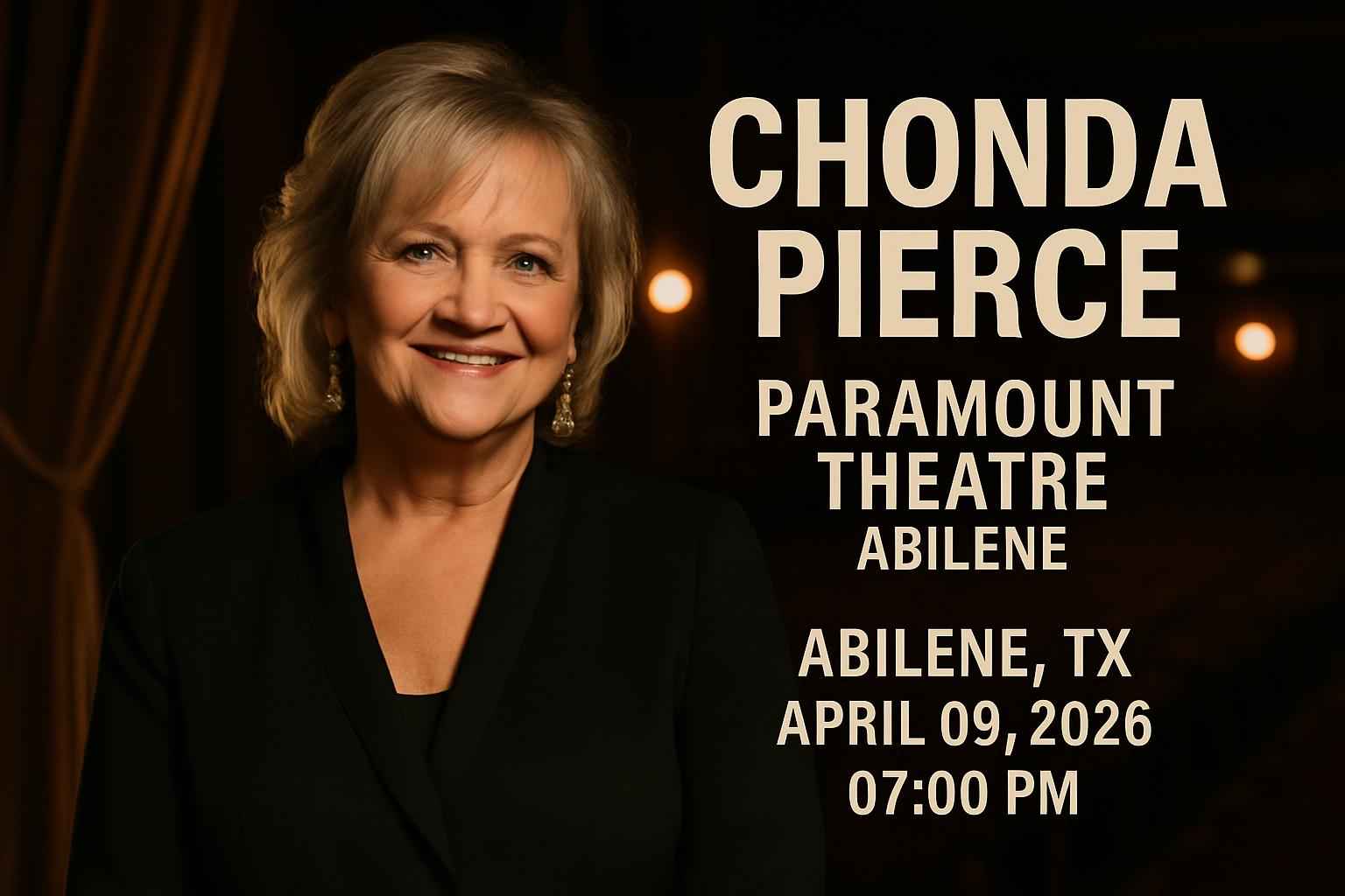 Experience an unforgettable evening with Chonda Pierce at Paramount Theatre in Abilene TX on April 09 2026 at 7 PM. This highly anticipated comedy event brings Americas top female comedian to the heart of Texas for a night of laughter and inspiration. Secure your Paramount Theatre Abilene tickets now and access exclusive promo codes through RSVP Event Agency for the best value on Chonda Pierce live event seats. Enjoy authentic ticket deals and unbeatable coupon codes trusted by Abilene locals and visitors seeking savings for this must-see performance.