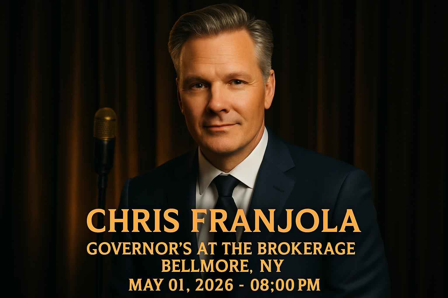 Chris Franjola delivers a fresh stand-up set at the iconic Governor’s Brokerage in Bellmore NY on May 01 2026. Doors open at 7 PM with the show starting promptly at 8 PM. The venue is located at 2797 Merrick Road Bellmore NY offering convenient access for Nassau County comedy fans and visitors. Enjoy an evening of nonstop entertainment in a historic Long Island club known for top-tier acts and a welcoming atmosphere.