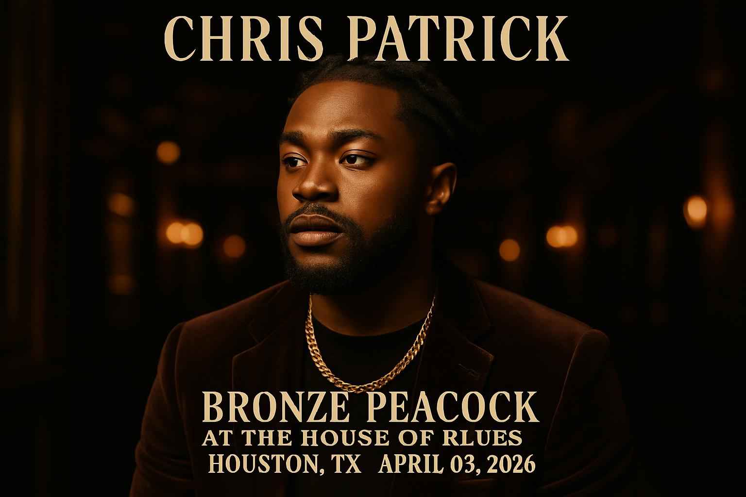 Chris Patrick brings his chart-topping energy to Houston on April 03 2026 at the legendary Bronze Peacock At The House Of Blues. Doors open at 7:00 PM. Enjoy a night of hip hop talent and vibrant crowd energy. Located in downtown Houston the House Of Blues offers easy access parking and a dynamic concert atmosphere. Book your tickets through RSVP Event Agency and use promo codes for extra savings today.