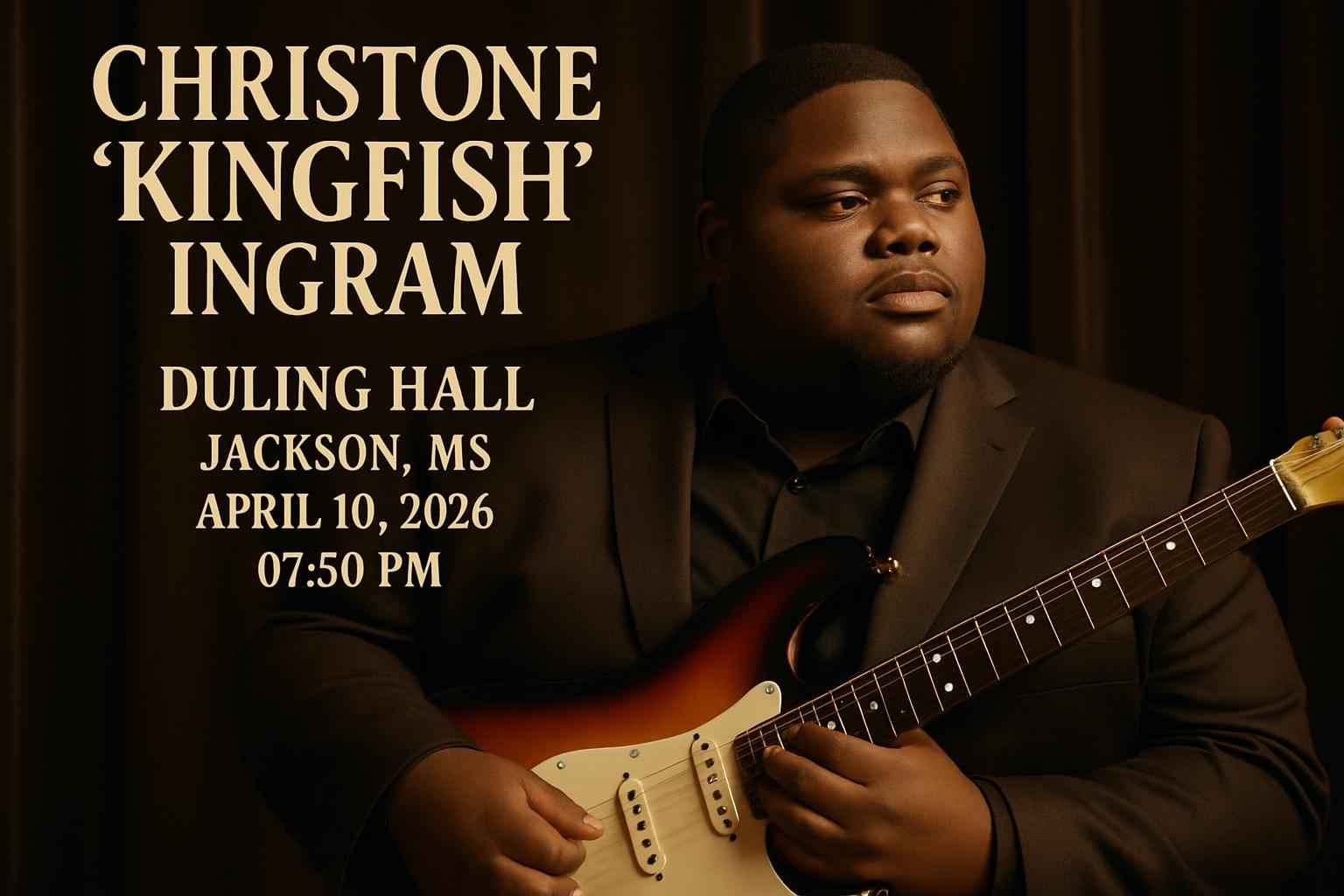 Christone Kingfish Ingram takes the stage at Duling Hall in Jackson MS on April 10 2026 at 7:30 PM.