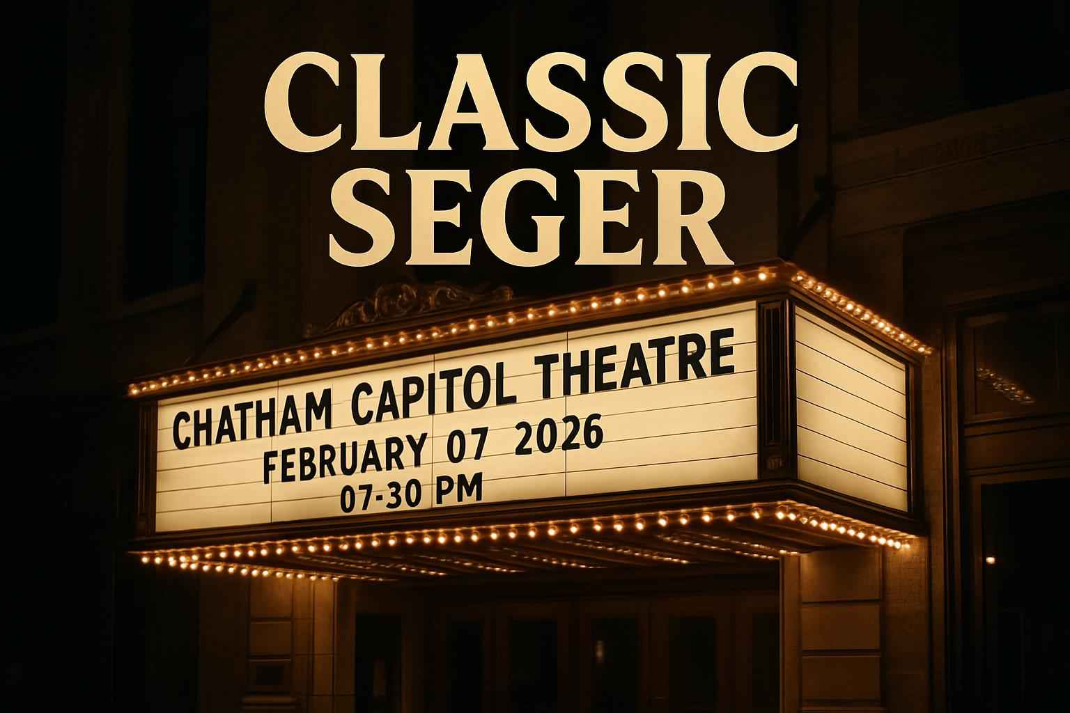 Classic Seger starts at 0730 PM on February 07 2026 at Chatham Capitol Theatre. Early arrival is recommended for best seating and parking.