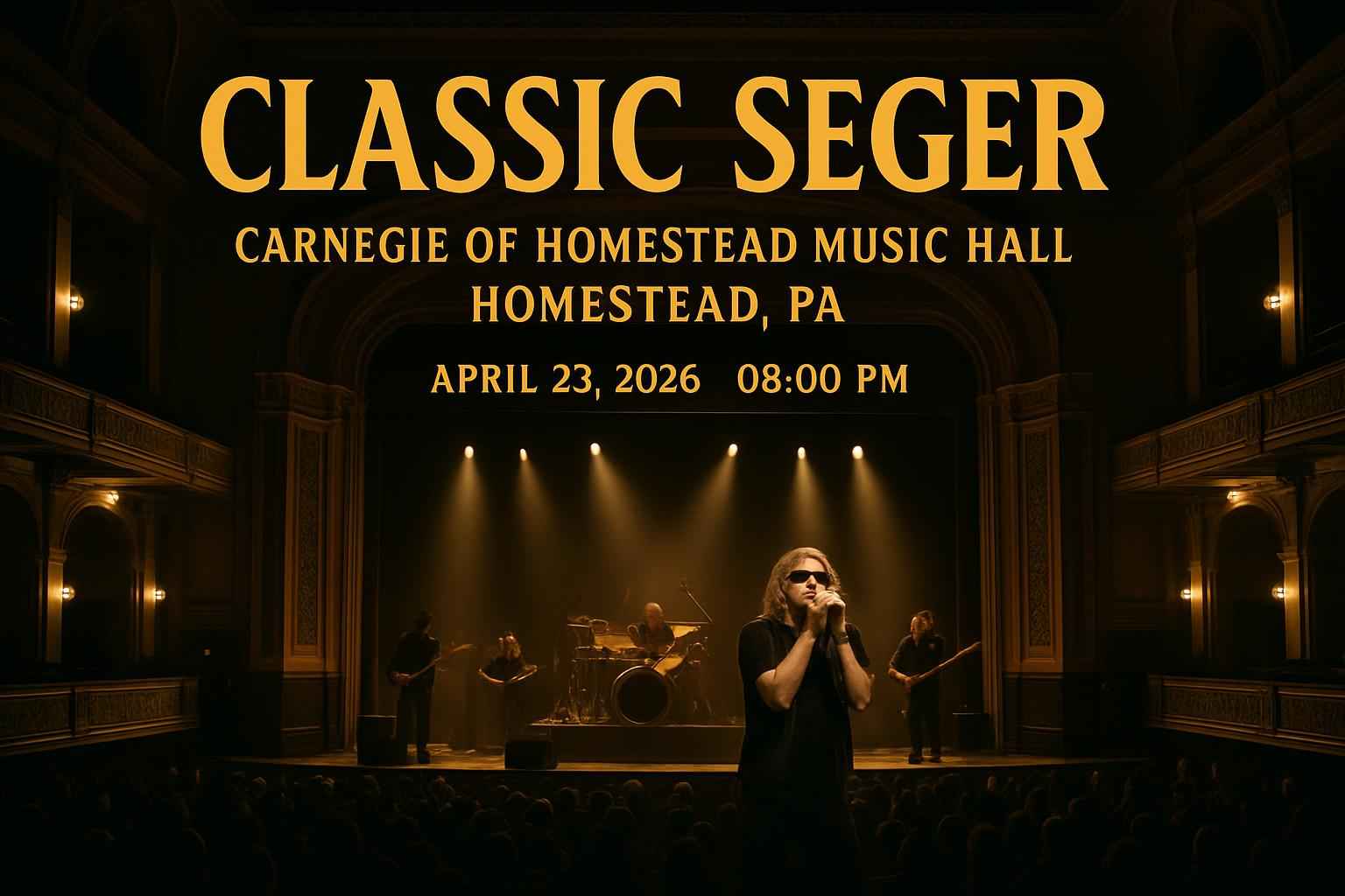 Experience Classic Seger at the historic Carnegie of Homestead Music Hall in Homestead PA on April 23 2026 at 8:00 PM. This tribute event brings the iconic sound of Bob Seger to life with authentic performances and high-energy music. Secure the lowest prices on Classic Seger tickets and maximize your savings with exclusive coupon codes only from RSVP Event Agency. Join Pittsburgh music fans for an unforgettable night of classic rock and local culture.