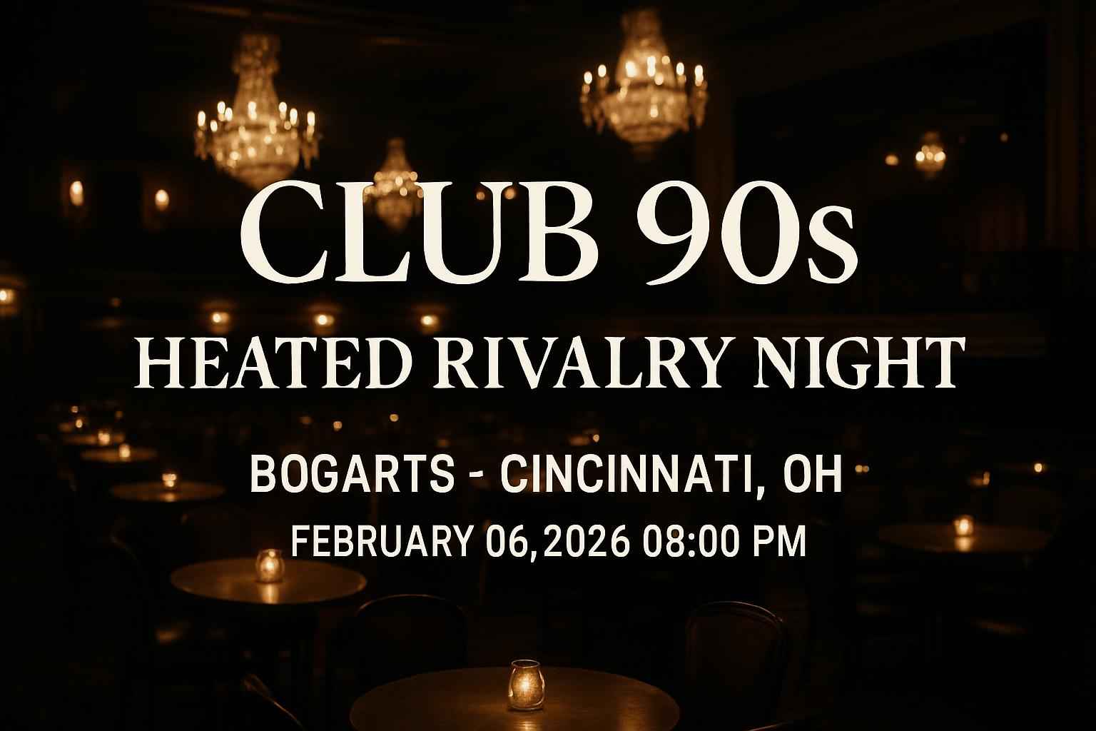 Club 90s: Heated Rivalry Night takes place at Bogarts in Cincinnati OH on Friday February 6 2026 starting at 8:00 PM. This event features back-to-back 90s music, DJs, and themed entertainment. Bogarts in Cincinnati is a local favorite for live events and parties, offering a spacious venue and vibrant nightlife atmosphere. Arrive early for the best experience and catch Cincinnati’s top 90s celebration.