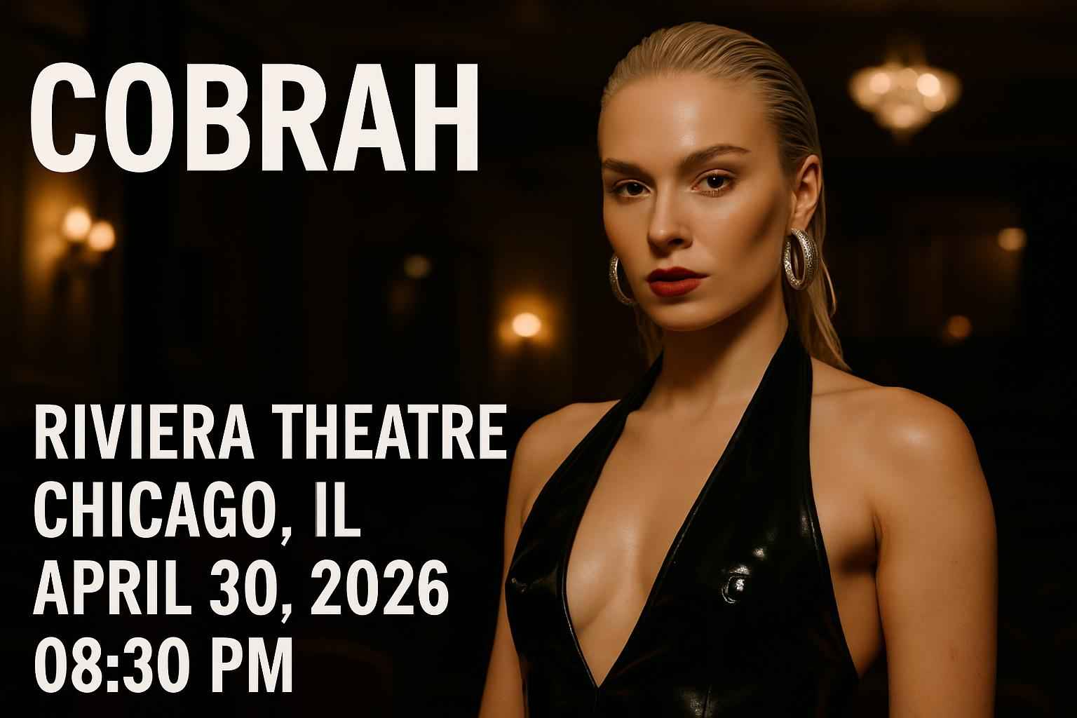 Event date is April 30 2026 starting at 0830 PM at Riviera Theatre 4746 N Racine Ave Chicago IL 60640. Cobrah brings a high-energy performance popular with fans of electronic pop and alternative music. Expect an immersive sound experience and vibrant lighting in one of Chicagos top-rated live music venues conveniently located near Uptown hotels and transit.