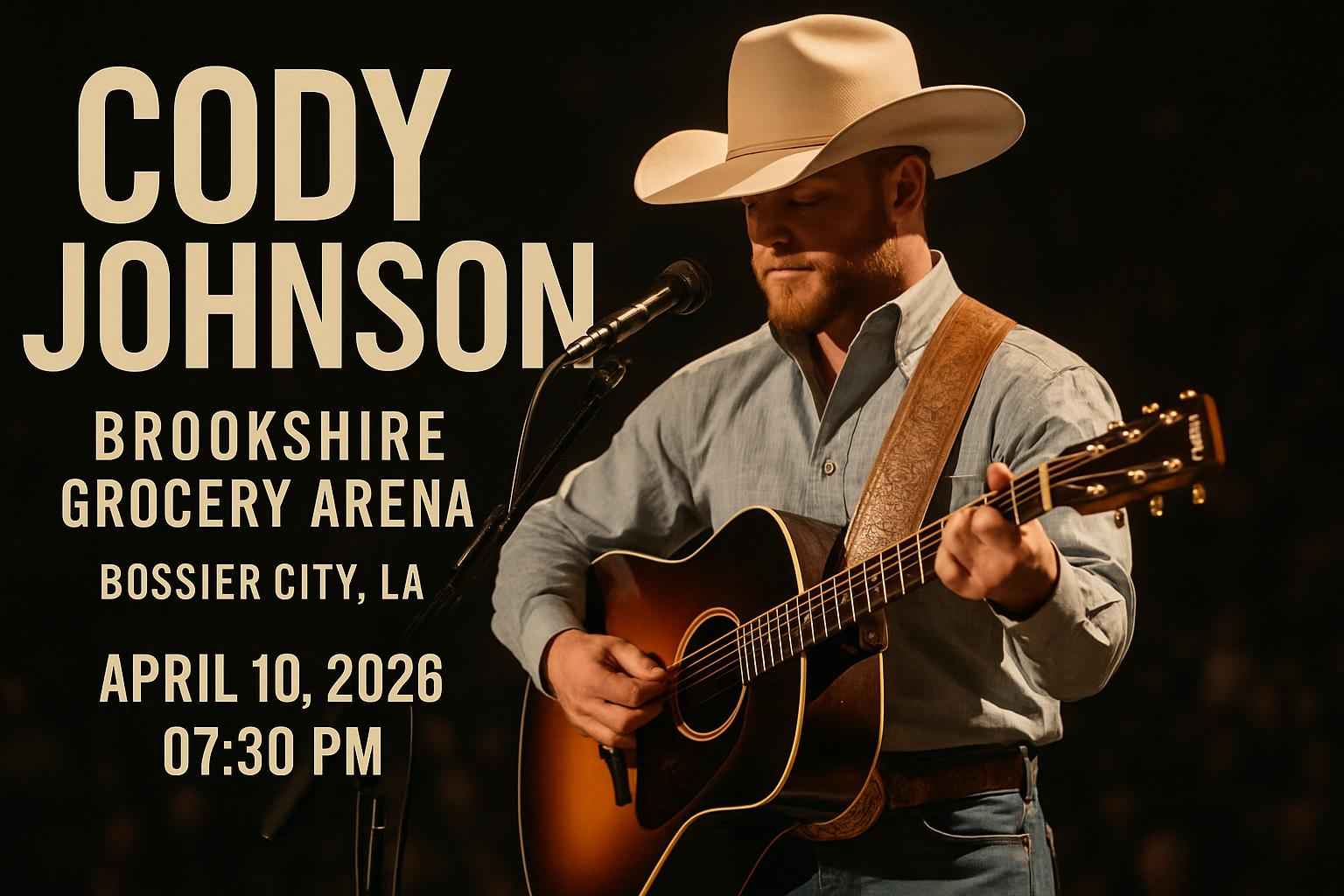 Cody Johnson brings authentic country music to Brookshire Grocery Arena located at 2000 Brookshire Arena Dr Bossier City LA. The show starts at 0730 PM on Friday April 10 2026. Expect a high-energy performance with chart-topping hits and crowd favorites. Fans searching for Cody Johnson concert tickets Bossier City or April 2026 country concerts in Louisiana can find all event details here.
