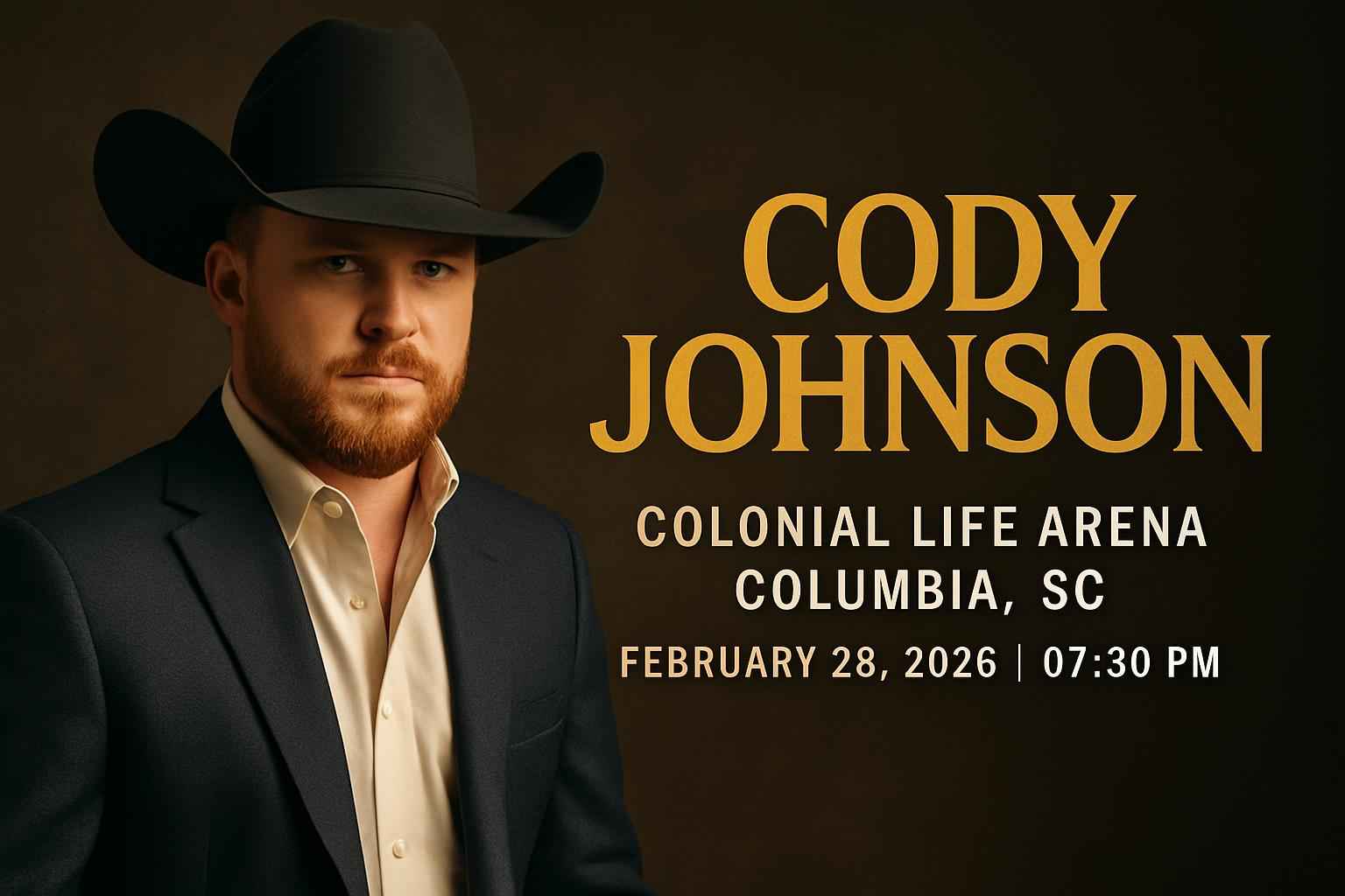 Cody Johnson brings his chart-topping country sound to Colonial Life Arena in Columbia SC on February 28 2026. Doors open at 0630 PM with the show starting at 0730 PM. The venue is located in the heart of Columbia close to hotels parking and popular dining spots. This event is part of Cody Johnsons 2026 tour with setlists featuring fan favorites and new hits. Join fans from Columbia Lexington and the Carolinas for a high-energy performance.