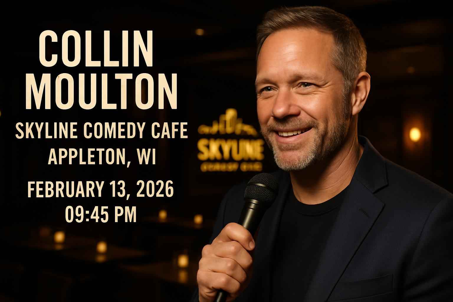Experience Collin Moulton live at Skyline Comedy Cafe in Appleton, WI on February 13, 2026, at 9:45 PM. Secure tickets with exclusive promo codes from RSVP Event Agency for the best discounts and seating. Enjoy convenient downtown parking and a welcoming venue atmosphere. Book early to guarantee availability and savings for this top stand-up comedy event.